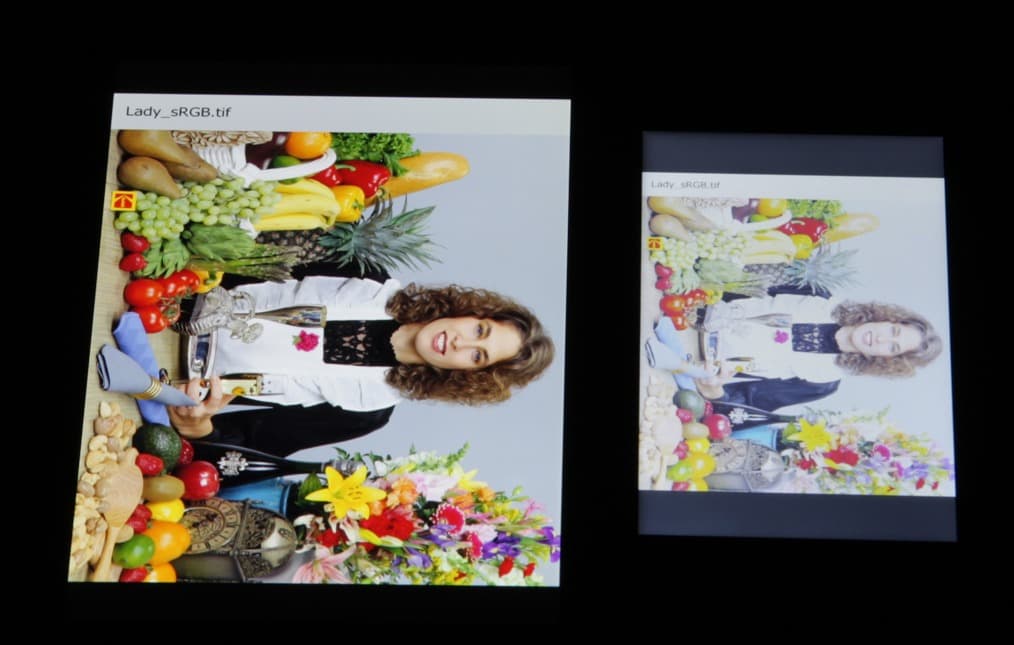 Экран имеет не самые плохие углы обзора в горизонтальном направлении, но при малейшем отклонении вниз инвертируются светлые оттенки, а при отклонении вверх — темные. Для сравнения приведем фотографии, на которых на экраны Nexus 7 и тестируемого устройства выведены одинаковые изображения, при этом яркость обоих экранов установлена примерно на 200 кд/м², а цветовой баланс на фотоаппарате принудительно переключен на 6500 К.