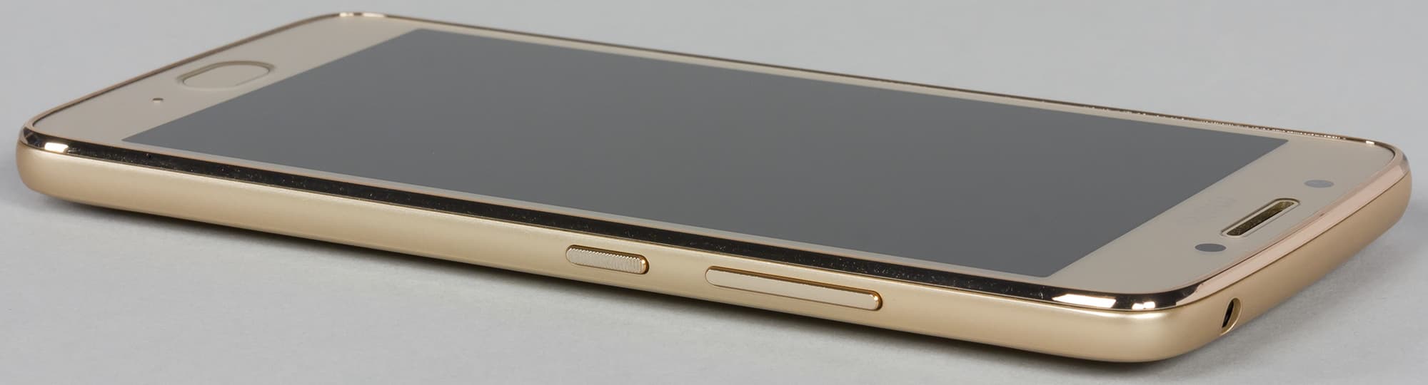 Moto G5 выпускается в двух цветовых вариантах: сером (Iron Gray) и золотистом (Fine Gold). У серого корпуса передняя панель под стеклом черная, а у золотистого имеет соответствующий золотистый цвет. Это делает образ визуально более целостным и законченным, но повторим, что золотистый вариант, на наш взгляд, все равно выглядит некрасивым.