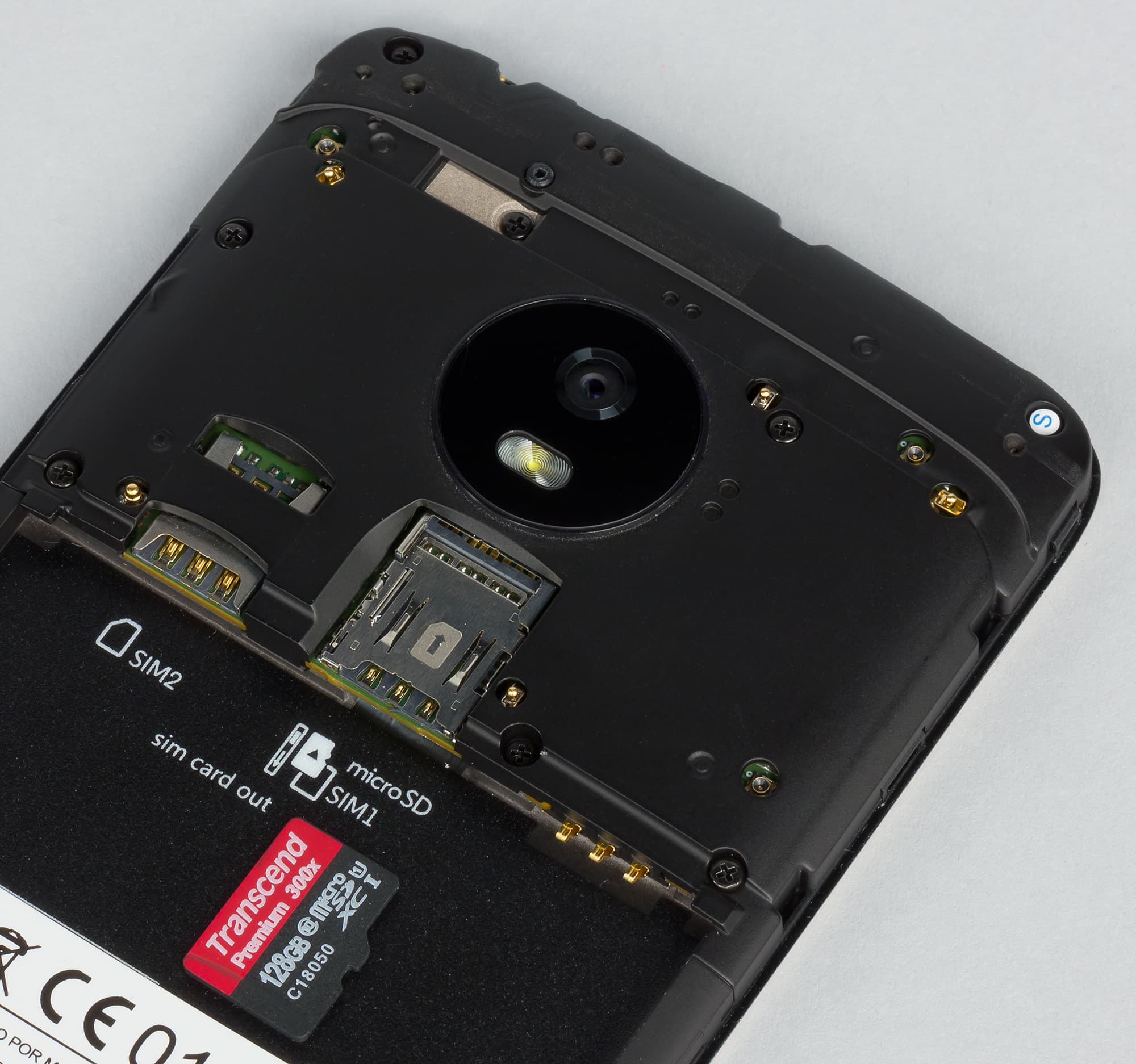 Для установки карточек необходимо снять заднюю крышку, она довольно крепко сидит на своих защелках и снимается туго. Под крышкой можно найти три отдельных слота, два из них — для карт Nano-SIM, еще один — для карты памяти microSD. Аккумуляторная батарея здесь съемная (что на сегодняшний день встречается безумно редко).