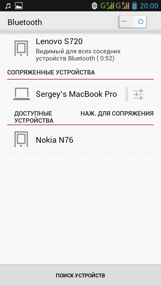 Работа модуля Bluetooth была проверена в нескольких режимах. Так, с его помощью выход в интернет получил ноутбук — смартфон здесь выступил в роли модема. Скорость обмена данными при передаче файла между Lenovo IdeaPhone S720 и MacBook Pro составила 1,6 Мбит/с. Подключение к беспроводной стереогарнитуре Sony MW1 прошло без каких бы то ни было эксцессов. Функциональность связки гарнитура/смартфон осталась на базовом уровне: управление воспроизведением музыки с демонстрацией названий треков и ответ на телефонные вызовы с демонстрацией номера абонента вместо его имени из списка контактов.