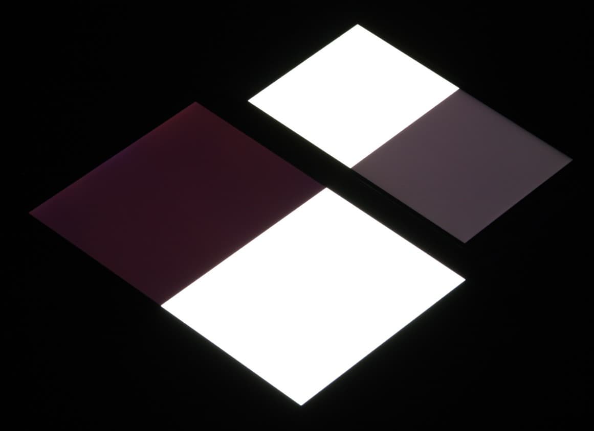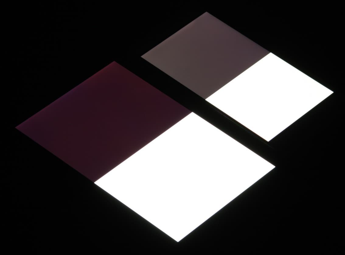Яркость под углом у экранов уменьшилась (как минимум в 5 раз, исходя из разницы в выдержке), но в случае LeTV One падение яркости больше. Черное поле при отклонении по диагонали высветляется в средней степени и приобретает красно-фиолетовый оттенок. Фотографии ниже это демонстрируют (яркость белых участков в перпендикулярном плоскости экранов направлении примерно одинаковая!):