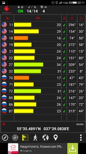 Навигационный модуль работает не только с GPS (с A-GPS), но также и с отечественной Глонасс. К работе модуля навигации претензий нет, первые спутники при холодном старте обнаруживаются в течение первой минуты. Среди датчиков смартфона имеется датчик магнитного поля, на основе которого работает цифровой компас в навигационных программах.