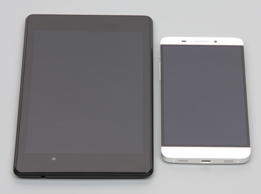 Лицевая поверхность экрана выполнена в виде стеклянной пластины с зеркально-гладкой поверхностью, устойчивой к появлению царапин. Судя по отражению объектов антибликовые свойства экрана не хуже, чем у экрана Google Nexus 7 (2013) (далее просто Nexus 7). Для наглядности приведем фотографию, на которой в выключенных экранах отражается белая поверхность (слева — Nexus 7, справа — LeTV One, далее их можно различать по размеру):