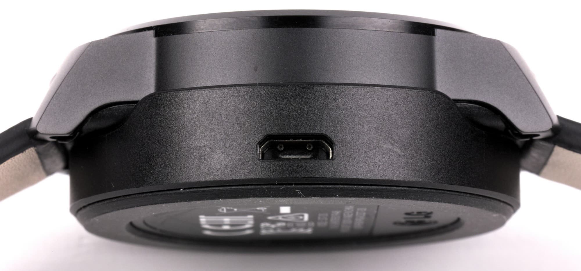 На боковой поверхности крэдла мы видим разъем Micro-USB. К нему и подключаем любое смартфонное зарядное устройство. В принципе, привычное и достаточно удобное решение, хотя, конечно, менее эффектное, чем у Moto 360, где в комплекте поставляется полноценная док-станция для беспроводной зарядки, на которую часы можно просто положить, не думая о совмещении контактов.