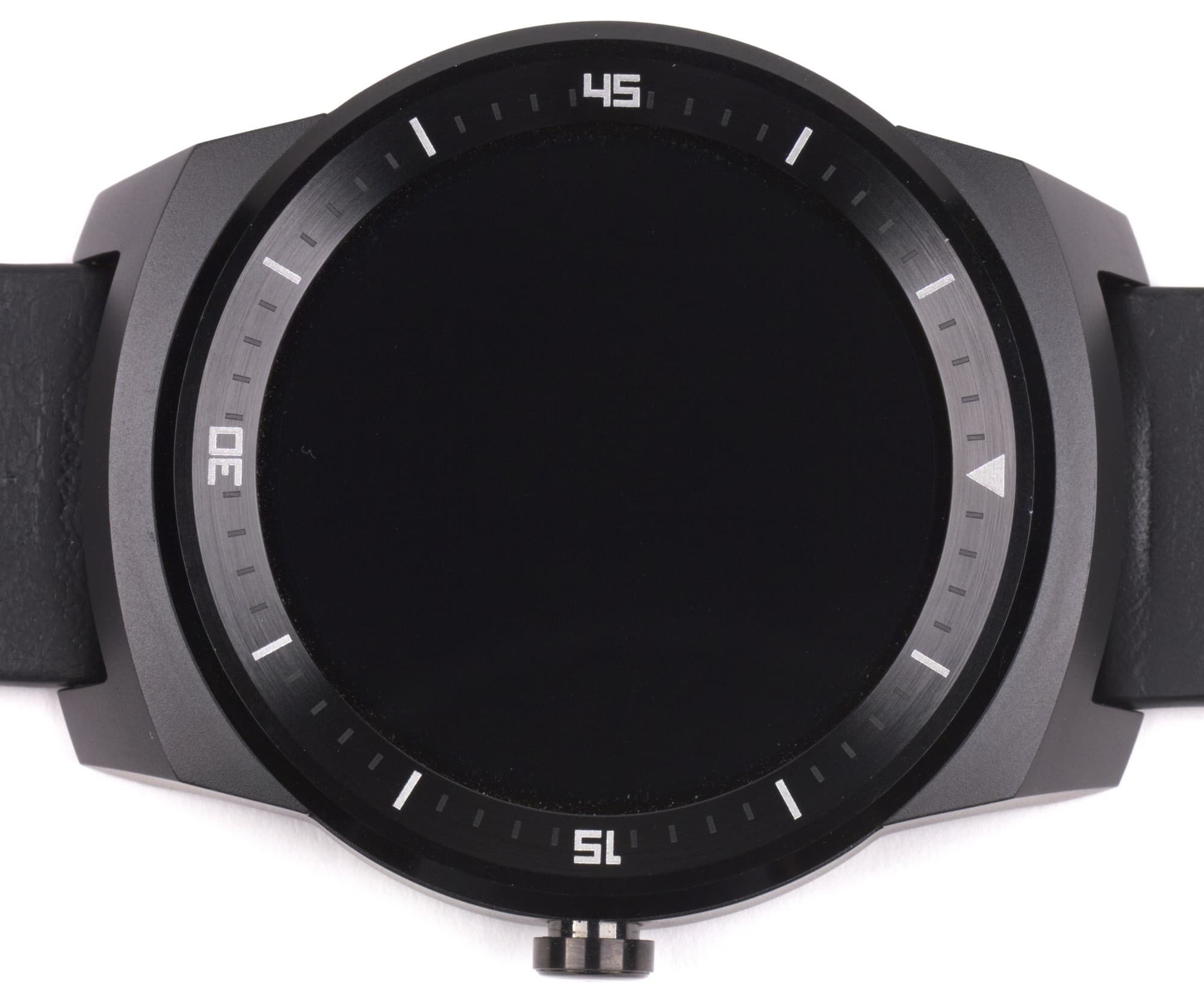 Корпус у LG G Watch R почти целиком выполнен из металла, выкрашенного в черный цвет. Пластиковая здесь только тыльная поверхность, прилегающая к руке, когда часы надеты. Пластик матовый, немного шершавый на ощупь.