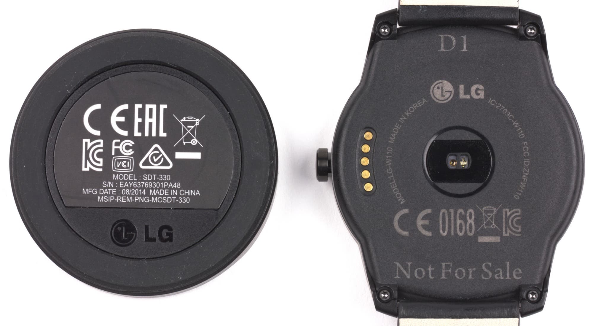 Здесь мы видим датчик измерения сердечного ритма и контакты для подсоединения к зарядному крэдлу. Разумеется, надписи Not For Sale на коммерческом образце не будет. На фото ниже — задние стороны LG G Watch R и Moto 360. У Moto 360 — тоже пластик, но только гладкий; для руки, впрочем, большой разницы нет, так как запястье с внешней стороны не очень чувствительно.