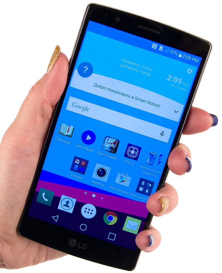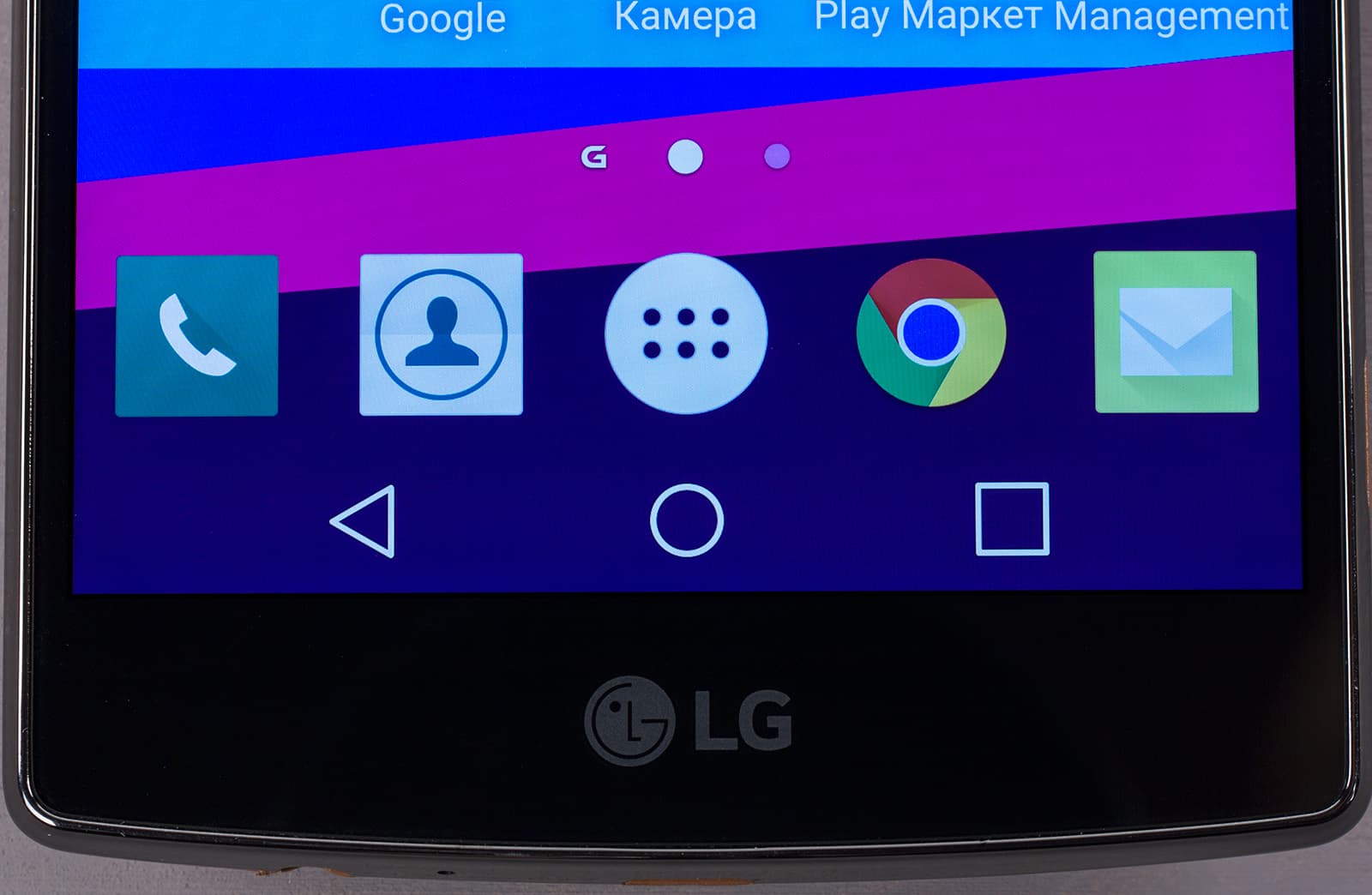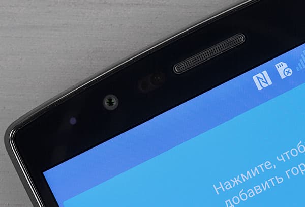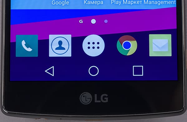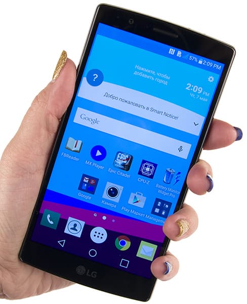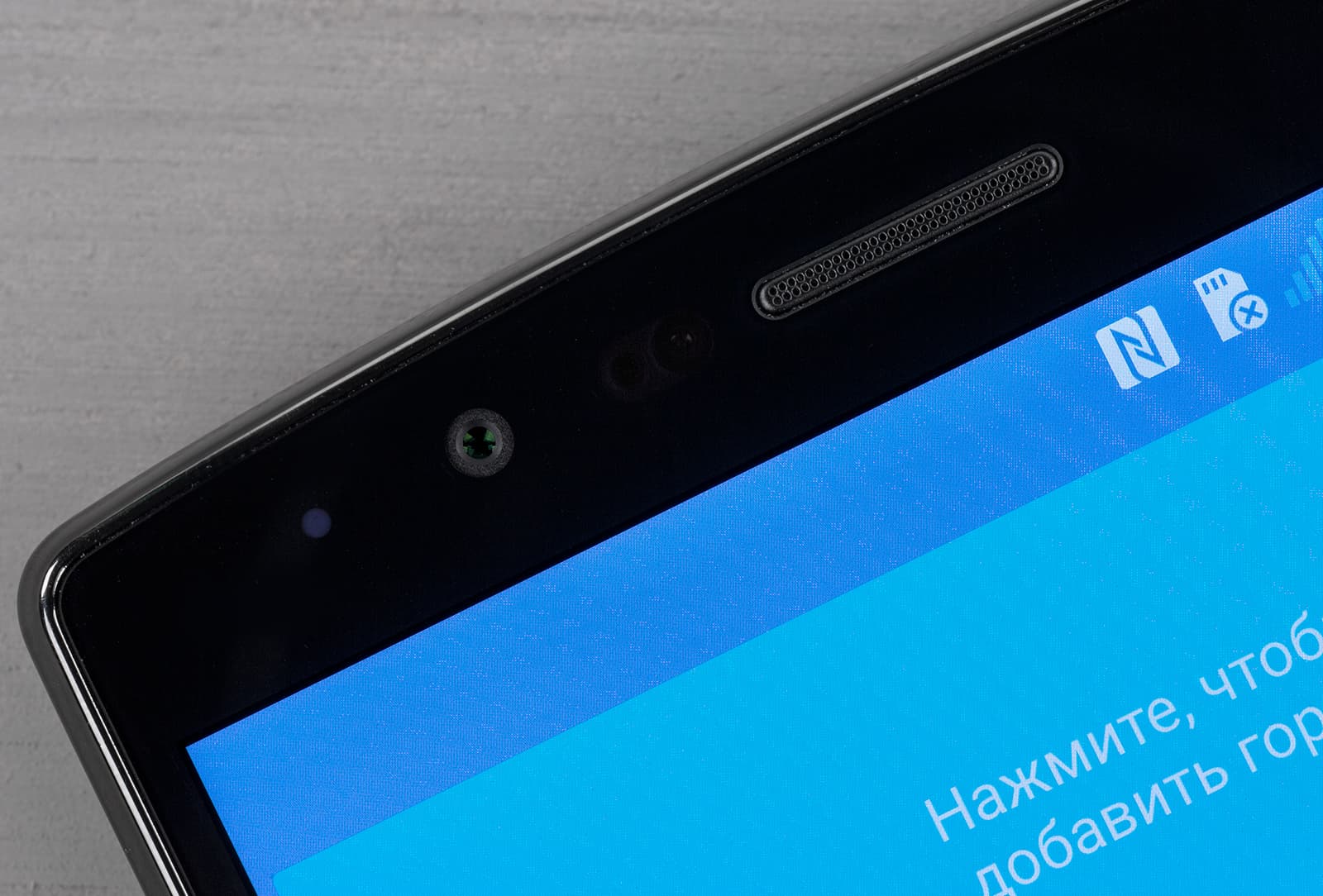 Размеры экрана составляют 68×121 мм, диагональ — 5,5 дюйма, разрешение — 2560×1440 точек. Соответственно, плотность точек здесь очень высока и составляет 538 ppi. Ширина рамки от края экрана до края корпуса составляет по бокам около 4 мм, сверху — 12 мм, снизу — 16 мм. Размеры рамки по бокам стали, к нашему удивлению, шире по сравнению с моделями LG G3 и G Flex 2, и это заметно даже на первый взгляд. Впрочем, все равно можно говорить о том, что огромный дисплей с диагональным размером 5,5 дюйма вписан в достаточно приемлемые габариты корпуса, если сравнивать с большинством конкурентов.