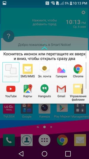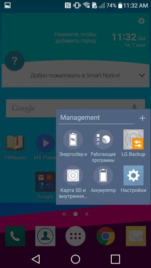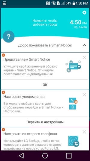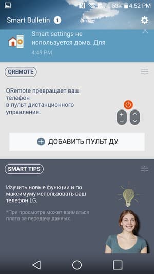 Все предыдущие наработки, воплощенные в прошлых вариантах фирменного интерфейса, представлены и в новейшей версии оболочки. Так, на месте возможность быстрого просмотра даты, времени, входящих сообщений простым жестом сдвига вниз без необходимости включать экран (Glance View). Самый левый экран рабочего стола отдан под виджеты с информацией, индивидуально настраиваемой под пользовательские предпочтения — LG Health, Smart Tips, Smart Notice, объединенные общим названием Smart Bulletin (при желании отключается в настройках). Есть возможность работать в двухоконном режиме, уменьшать в размерах и перемещать на рабочем экране окна с приложениями в режиме QSlide, инфракрасный порт дополнен специальной программой для дистанционного управления бытовой техникой Smart Remote. Никуда не исчезли и фирменные режимы блокировки Knock Code и гостевой режим, хотя разблокирование с помощью сканера отпечатков было бы удобнее, чем набивший оскомину Knock Code. Комбинацию виртуальных кнопок управления в нижней части экрана можно изменить и подстроить под свой вкус, реализована поддержка жестов.