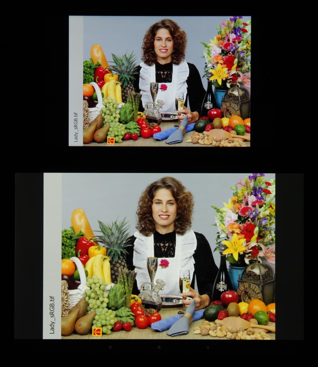 Из-за широкого охвата цвета неестественные, это усугубляется небольшим повышением цветового контраста, искаженным цветовым балансом, неотключаемым повышением контурной резкости и динамической подстройкой яркости подсветки. В итоге от исходного изображения остается не так уж и много — зато ярко, четко и цветасто.