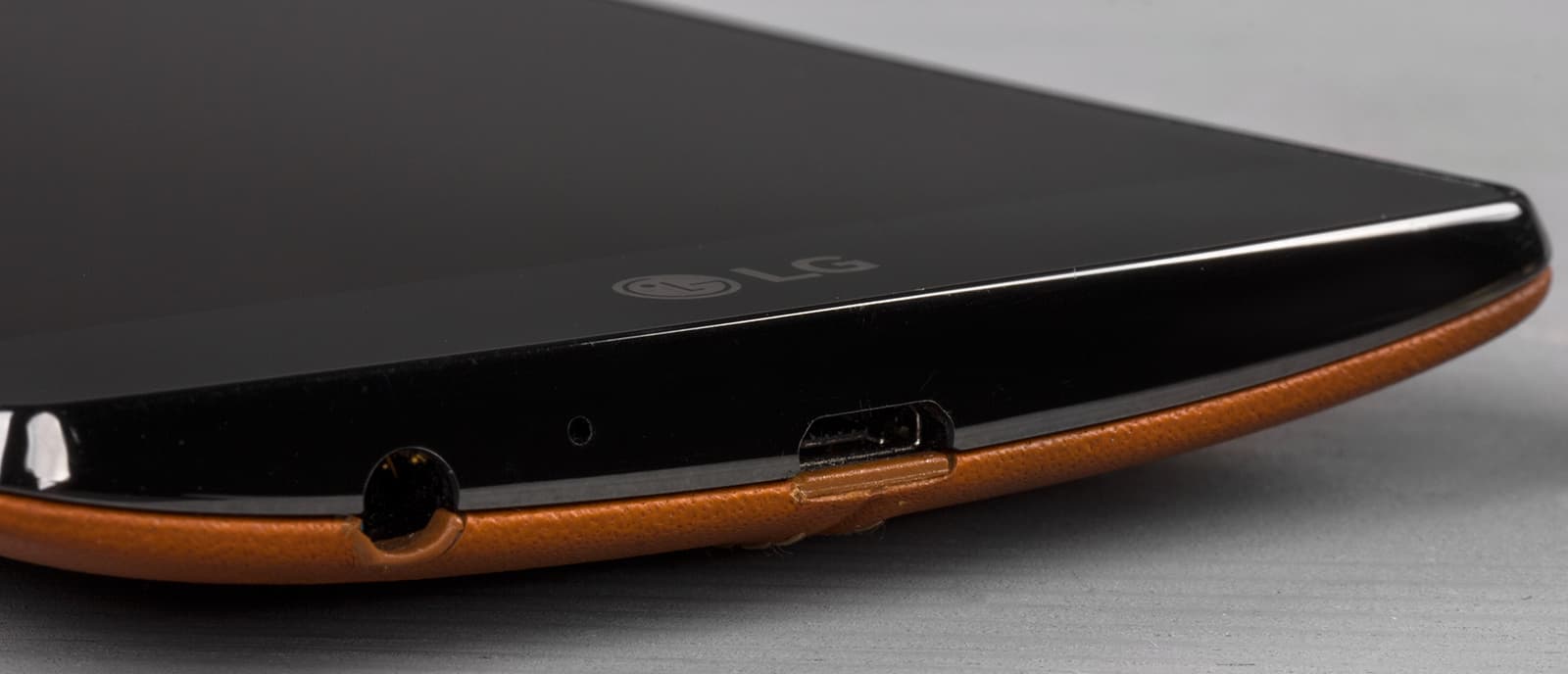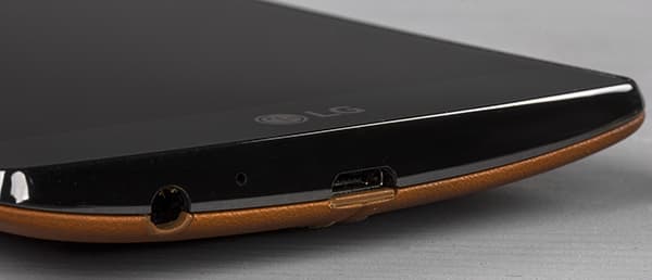 На нижнем торце разместились оба разъема: аудиовыход для наушников (миниджек) и универсальный Micro-USB 2.0, поддерживающий подключение устройств в режиме OTG. Крышками и заглушками разъемы не прикрыты, поскольку смартфон не обеспечен защитой от воды. Крепления для ремешка на корпусе тоже нет. Беспроводную зарядку, в отличие от своего предшественника LG G3, аппарат не поддерживает.