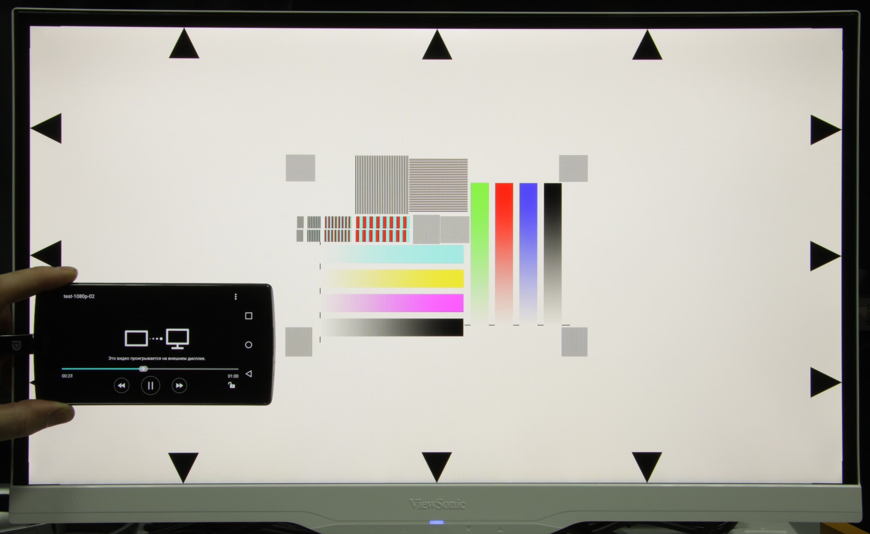 Особого описания заслуживает вывод видео. Для начала с помощью набора тестовых файлов с перемещающимися на одно деление за кадр стрелкой и прямоугольником (см. «Методика тестирования устройств воспроизведения и отображения видеосигнала. Версия 1 (для мобильных устройств)») мы проверили, как видео выводится на экран самого смартфона. Снимки экрана с выдержкой в 1 с помогли определить характер вывода кадров видеофайлов с различными параметрами: варьировались разрешение 1280 на 720 (720p), 1920 на 1080 (1080p) и 3840 на 2160 (4K) пикселей и частота кадров 24, 25, 30, 50 и 60 кадр/с. В этом тесте мы использовали видеоплеер MX Player в режиме «Аппаратный». Результаты этого (блок, озаглавленный как «Экран смартфона») и следующего теста сведены в таблицу: