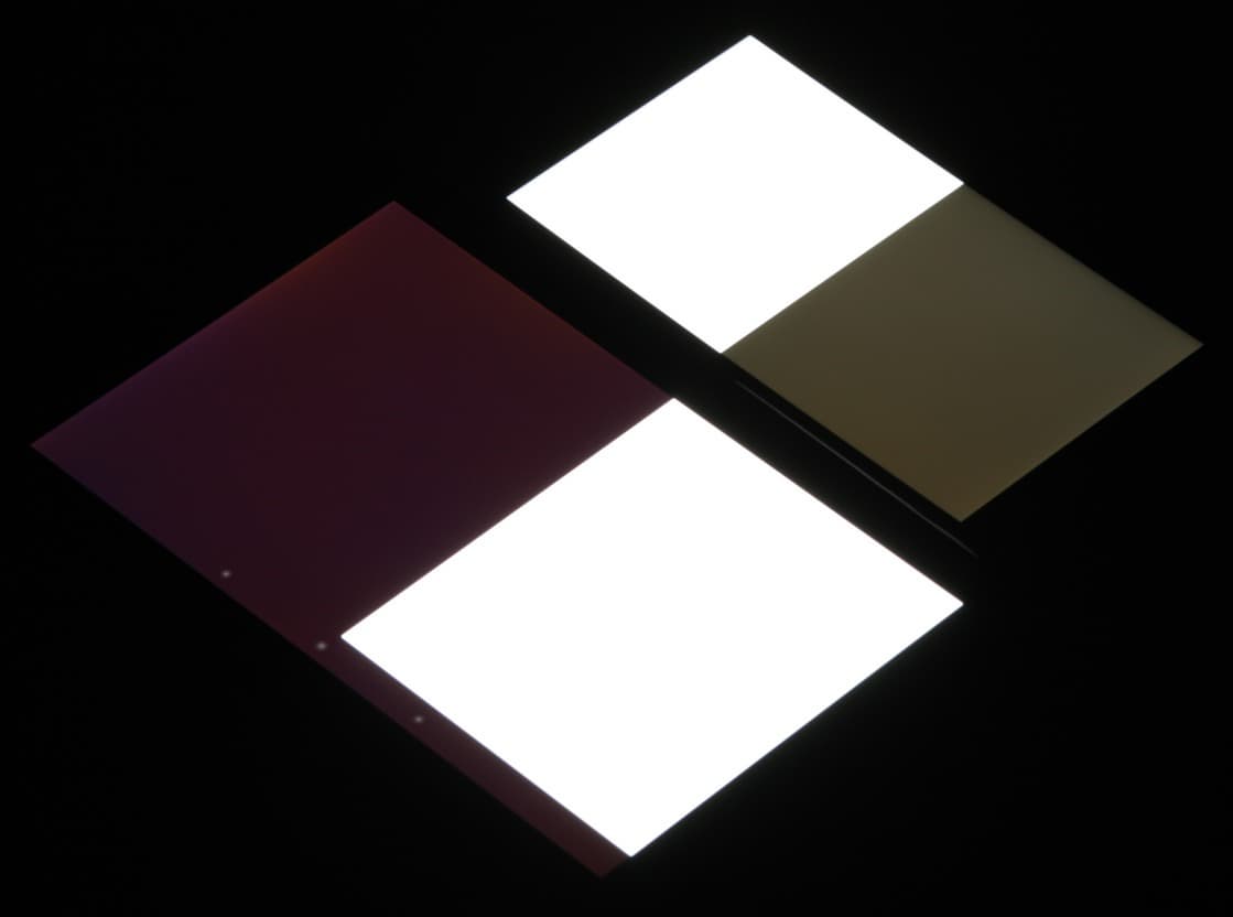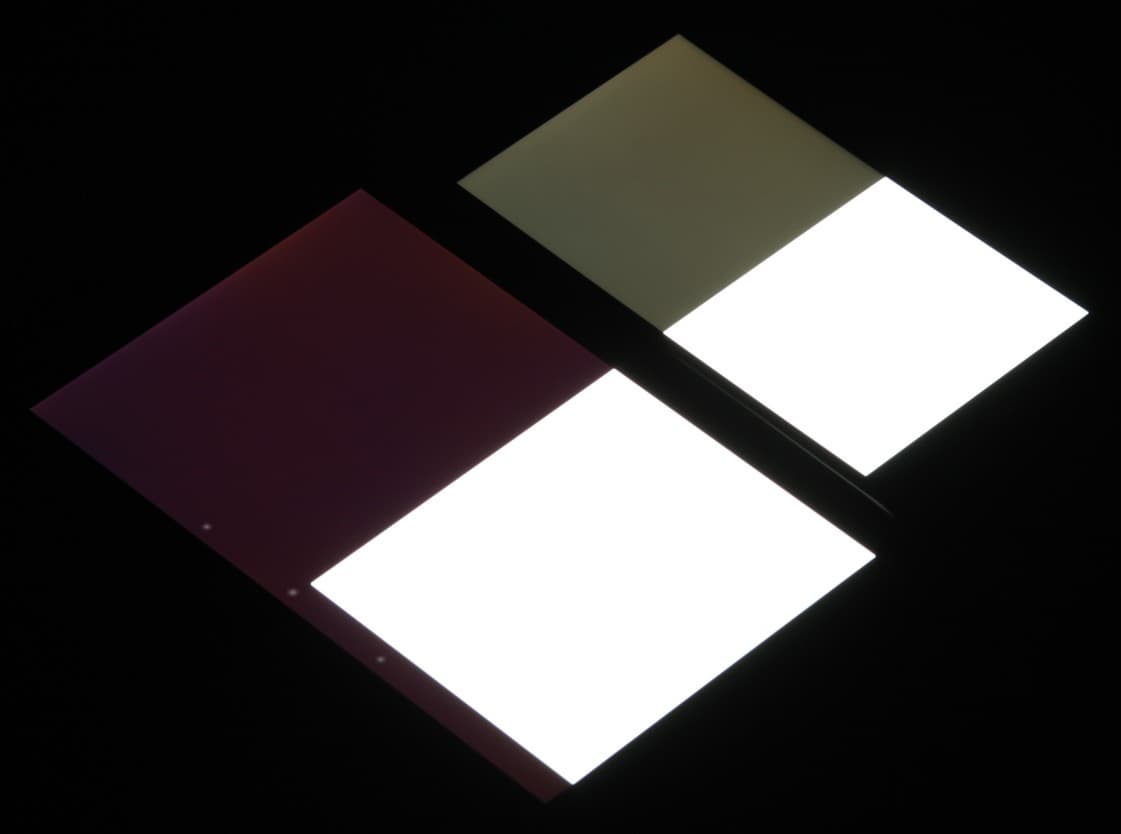 Яркость под углом у экранов уменьшилась (как минимум в пять раз, исходя из разницы в выдержке), однако в случае LG G4 яркость снизилась чуть меньше. Черное поле при отклонении по диагонали высветляется сильно, но остается условно нейтрально-серым по оттенку. Фотографии ниже это демонстрируют (яркость белых участков в перпендикулярном плоскости экранов направлении у экранов одинаковая!):