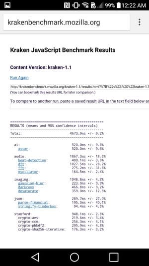 Что касается бенчмарков для оценки скорости движка javascript, то стоит всегда делать скидку на то, что в них результаты существенно зависят от браузера, в котором запускаются, так что сравнение может быть истинно корректным только на одинаковых ОС и браузерах, а такая возможность имеется при тестировании не всегда. В случае с ОС Android мы всегда стараемся использовать Google Chrome.