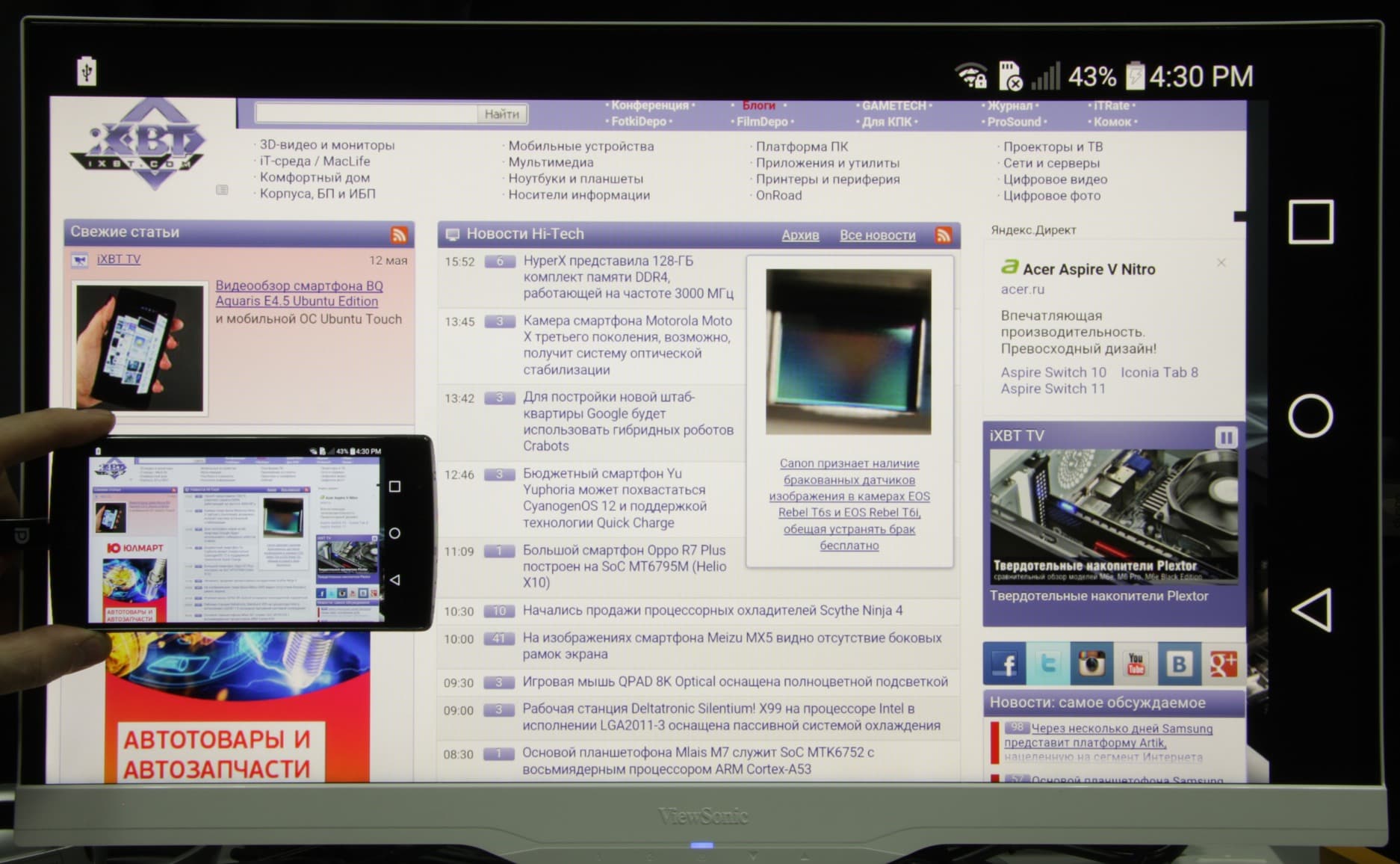 В этом смартфоне есть поддержка адаптеров SlimPort (или Mobility DisplayPort, заявлена поддержка вывода видео вплоть до разрешения 4К), подключаемых к разъему Micro-USB и обеспечивающих передачу видеосигнала (и звука) на внешние устройства отображения. Для его тестирования мы использовали монитор ViewSonic VX2363Smhl. При использовании этого монитора и имевшегося у нас адаптера SlimPort вывод осуществлялся в разрешении 1920 на 1080 пикселей с частотой 60 кадр/с. При ландшафтной ориентации смартфона вывод изображения на экраны смартфона и монитора осуществляется по возможности в ландшафтной ориентации, при этом изображение на мониторе вписано в границы экрана и представляет собой интерполированную копию экрана смартфона.
