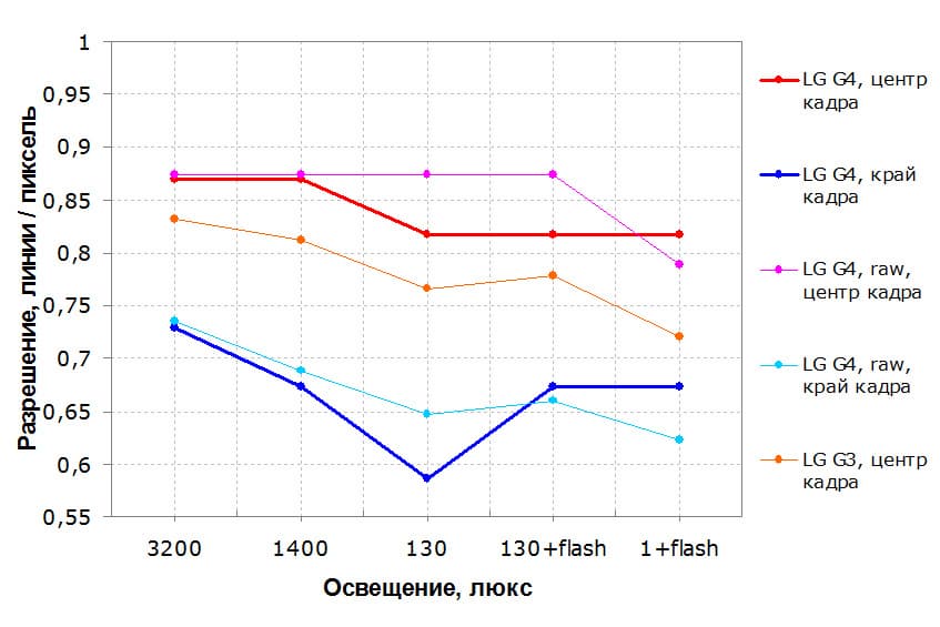 Насыщенность в случае LG G4 явно завышена. Как показали дополнительные тесты, это завышение достигается как за счет широкого охвата, так и за счет небольшого повышения цветового контраста. Также отметим, что красный цвет имеет слегка неестественный оттенок (визуально это заметно лучше, чем по фотографии). Кроме того, на изображениях видно, что в какой-то степени увеличивается и контурная резкость. По всей видимости, такая обработка изображения выполняется программно на очень низком уровне, так как ее результат виден во всех опробованных программах, выводящих растровые изображения.