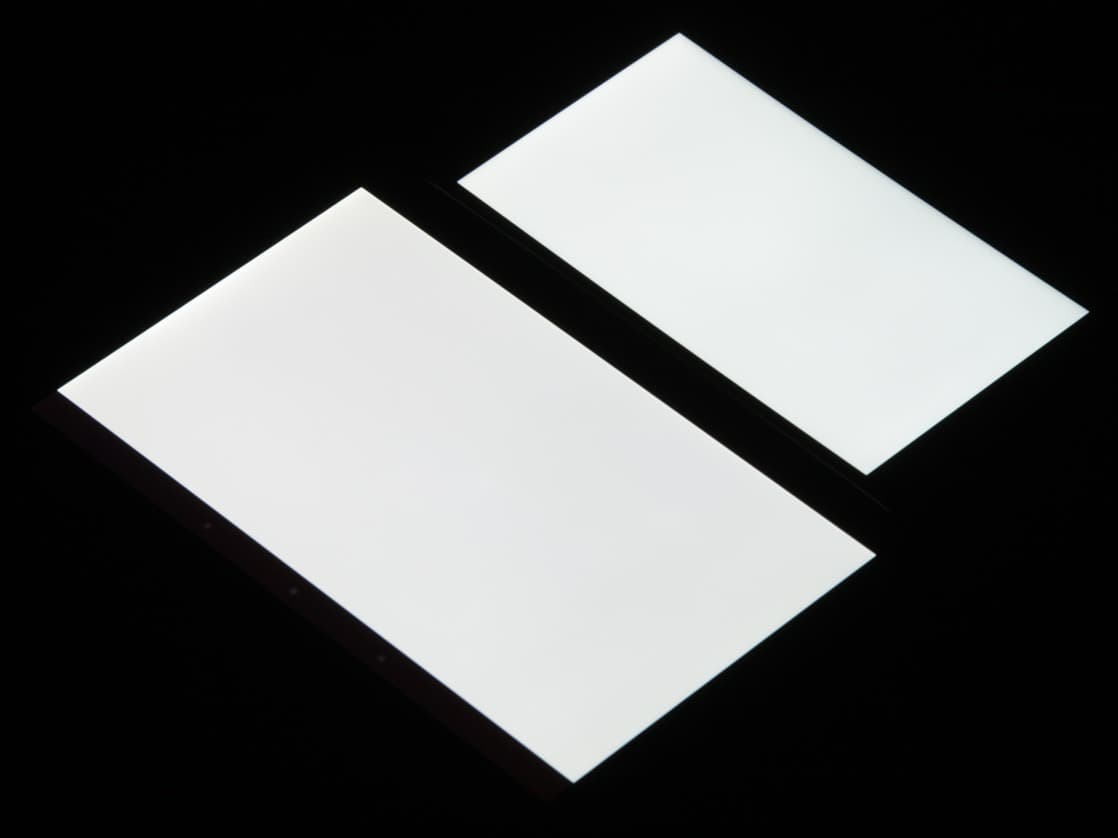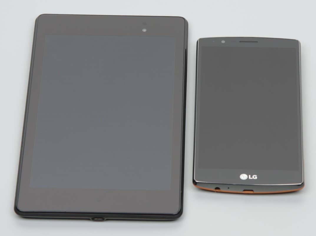 Лицевая поверхность экрана выполнена в виде стеклянной пластины с зеркально-гладкой поверхностью, устойчивой к появлению царапин. Судя по отражению объектов антибликовые свойства экрана лучше, чем у экрана Google Nexus 7 (2013) (далее просто Nexus 7). Для наглядности приведем фотографию, на которой в выключенных экранах отражается белая поверхность (слева — Nexus 7, справа — LG G4, далее их можно различать по размеру):