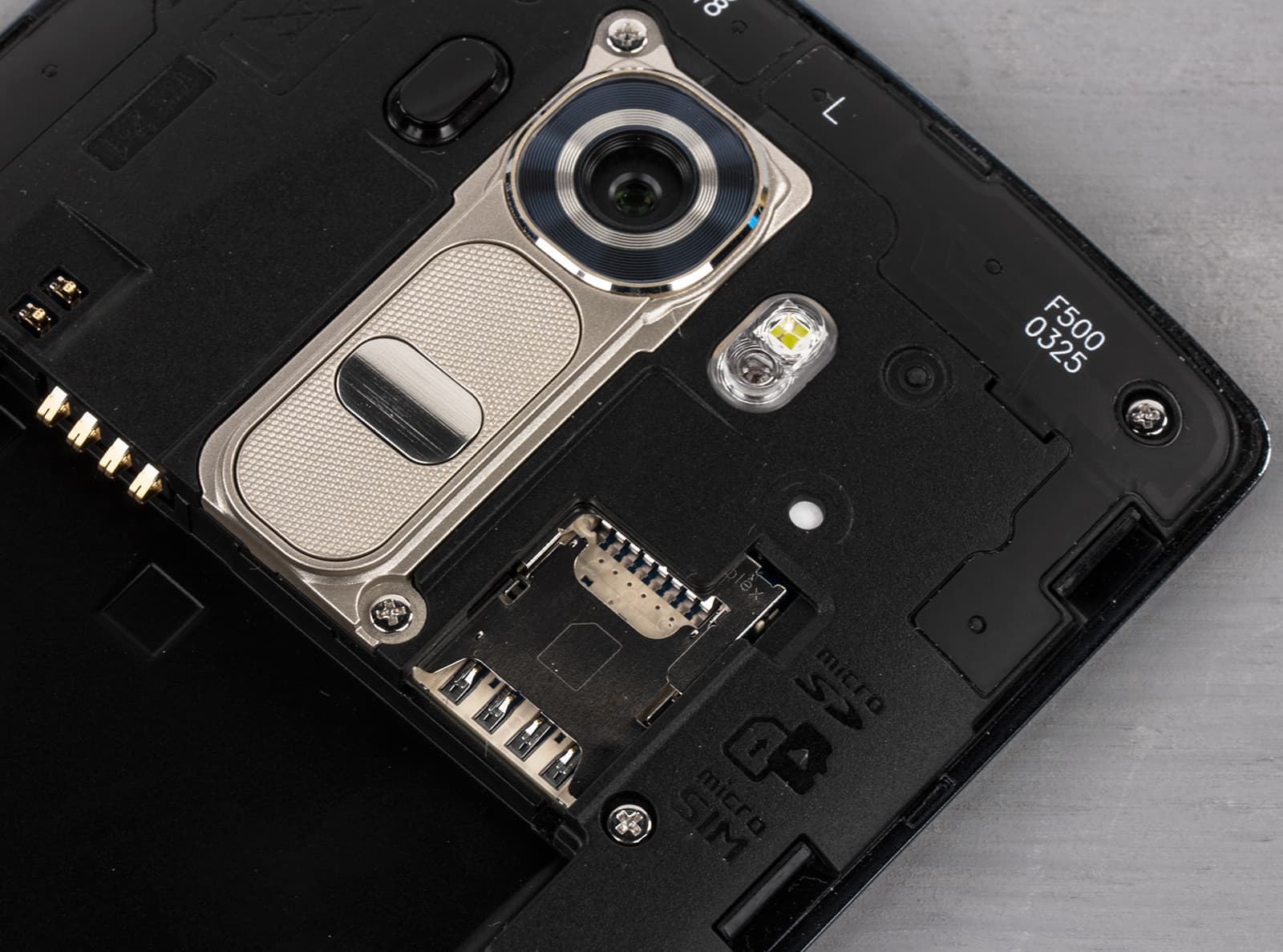 Крышка достаточно легко снимается, под ней скрывается единственный сдвоенный слот для SIM-карты и карты памяти, других разъемов нет. Батарея, в отличие от G Flex 2, здесь съемная. SIM-карта в данном случае поддерживается лишь одна, но будет выпущена и модификация с поддержкой двух SIM-карт. Формат используется не Nano-, а Micro-SIM, что можно считать минусом, поскольку благодаря Apple и большинству мировых брендов все современные флагманские новинки уже рассчитаны на Nano-SIM, здесь же может понадобиться переходник.