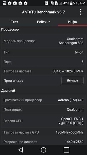 - SoC Qualcomm Snapdragon 808, 6 ядер: 2×1,8 ГГц (ARM Cortex-A57) + 4×1,5 (ARM Cortex-A53)