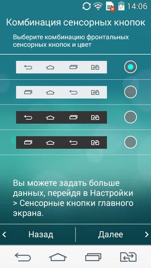 В нижней части под экраном аппаратных кнопок нет, все они теперь стали наэкранными. Традиционно для двухсимочных аппаратов LG здесь имеется не три, а целых четыре кнопки, одна из которых, дополнительная, отвечает за быструю смену приоритетной SIM-карты. В прошлых бюджетных аппаратах LG все эти кнопки были аппаратными и сенсорными, но подсветки не имели, так что переход их в наэкранную форму можно считать большим плюсом — теперь в темноте кнопки хорошо видно, к тому же их взаимное расположение можно самостоятельно поменять в настройках системы.