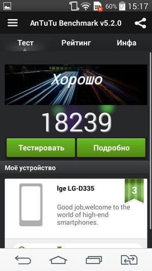 По результатам тестирования в бенчмарках смартфон LG L Bello ожидаемо можно отнести к разряду аппаратов со средним уровнем производительности, типичным для данной платформы. В целом, на текущий момент аппаратной производительности смартфона должно хватать для выполнения большинства основных задач, которые могут поставить приложения из Google Play Store, не считая самых требовательных игр, так как видеоподсистема испытуемого демонстрирует достаточно скромные результаты в специализированных графических тестах.
