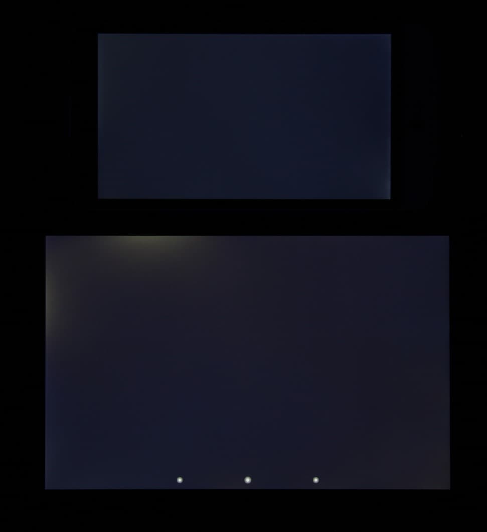 Яркость под углом у экранов уменьшилась (как минимум в 5 раз, исходя из разницы в выдержке), но в случае LG L Bello падение яркости больше. Черное поле при отклонении по диагонали высветляется сильно и приобретает фиолетовый оттенок или остается почти нейтрально-серым. Фотографии ниже это демонстрируют (яркость белых участков в перпендикулярном плоскости экранов направлении примерно одинаковая!):