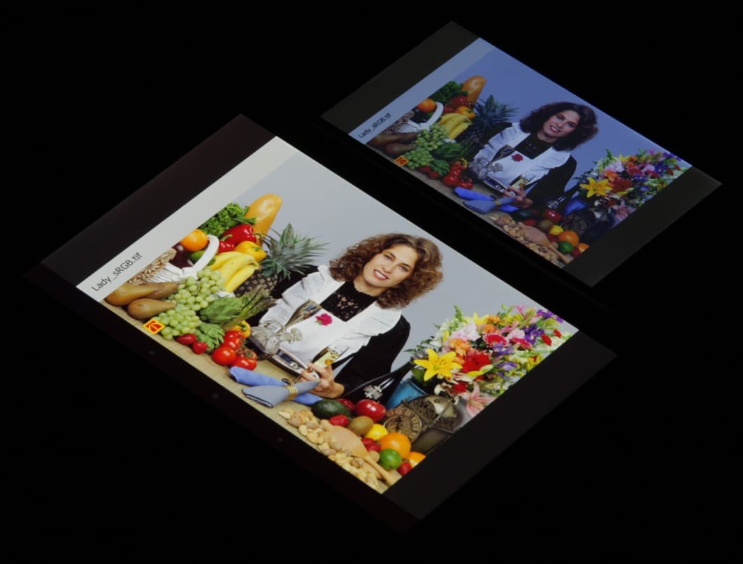 Цветопередача хорошая и цвета выглядят насыщенными у обоих экранов, хотя цветовой баланс несколько различается. Теперь под углом примерно 45 градусов к плоскости и к стороне экрана: