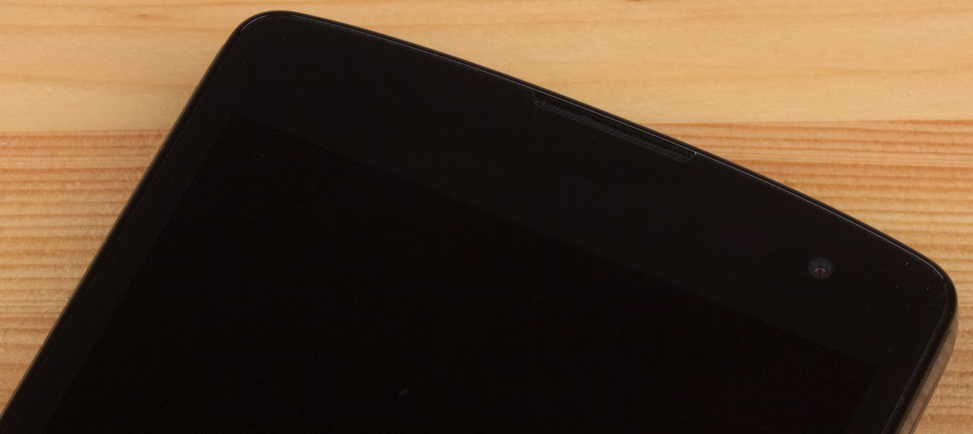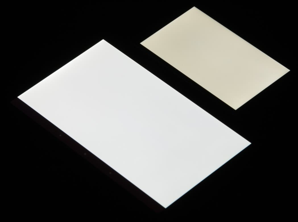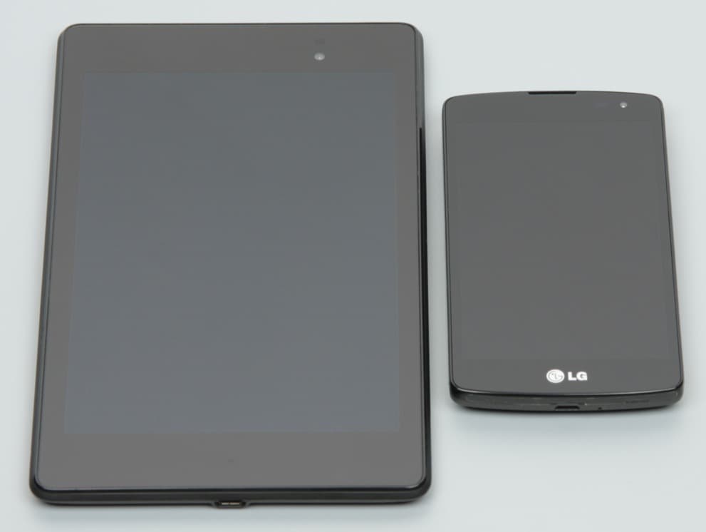 Лицевая поверхность экрана выполнена в виде стеклянной пластины с зеркально-гладкой поверхностью, устойчивой к появлению царапин. Судя по отражению объектов антибликовые свойства экрана не хуже, чем у экрана Google Nexus 7 (2013) (далее просто Nexus 7). Для наглядности приведем фотографию, на которой в выключенных экранах отражается белая поверхность (слева — Nexus 7, справа — LG L Fino, далее их можно различать по размеру):