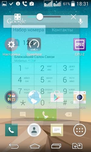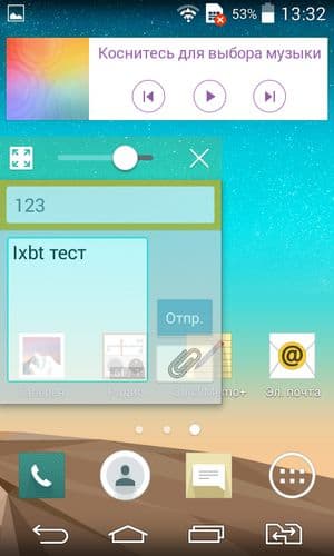 Функция QSlide позволяет делать рабочие окна меньше, отцеплять их, перемещая по экрану, а также менять степень их прозрачности и количество одновременно отображаемых окон. Уменьшенные окна продолжают функционировать в полной мере: например, в таком окошке может проигрываться видео. Если увеличить степень прозрачности окон до максимума, то элементы других окон, проглядывающие сквозь них, становятся интерактивными. В данном аппарате можно одновременно задействовать лишь до двух окон QSlide.