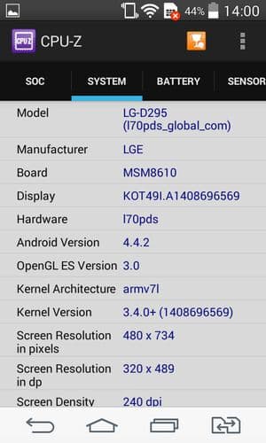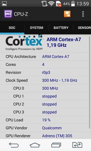Аппаратная платформа LG L Fino строится на базе однокристальной системы (SoC) Qualcomm Snapdragon 200 (MSM8610). Центральный процессор здесь имеет 4 ядра ARM Cortex-A7, работающих на частоте 1,2 ГГц. В роли графического ускорителя выступает GPU Adreno 305. Оперативной памяти в устройстве предусмотрен 1 ГБ, а хранилище, доступное пользователю для загрузки собственных файлов, составляет всего лишь около 1 ГБ из номинально обозначенных 4 ГБ — остальное ушло на саму систему и приложения. Встроенной памяти чрезвычайно мало, но ее объем можно нарастить за счет карточек microSD. Правда, это все равно не поможет в случае с установкой большого числа приложений, так как они на карту памяти штатными средствами не установятся. Подключить флэш-накопитель через OTG-переходник здесь не получится — аппарат данный режим не поддерживает.