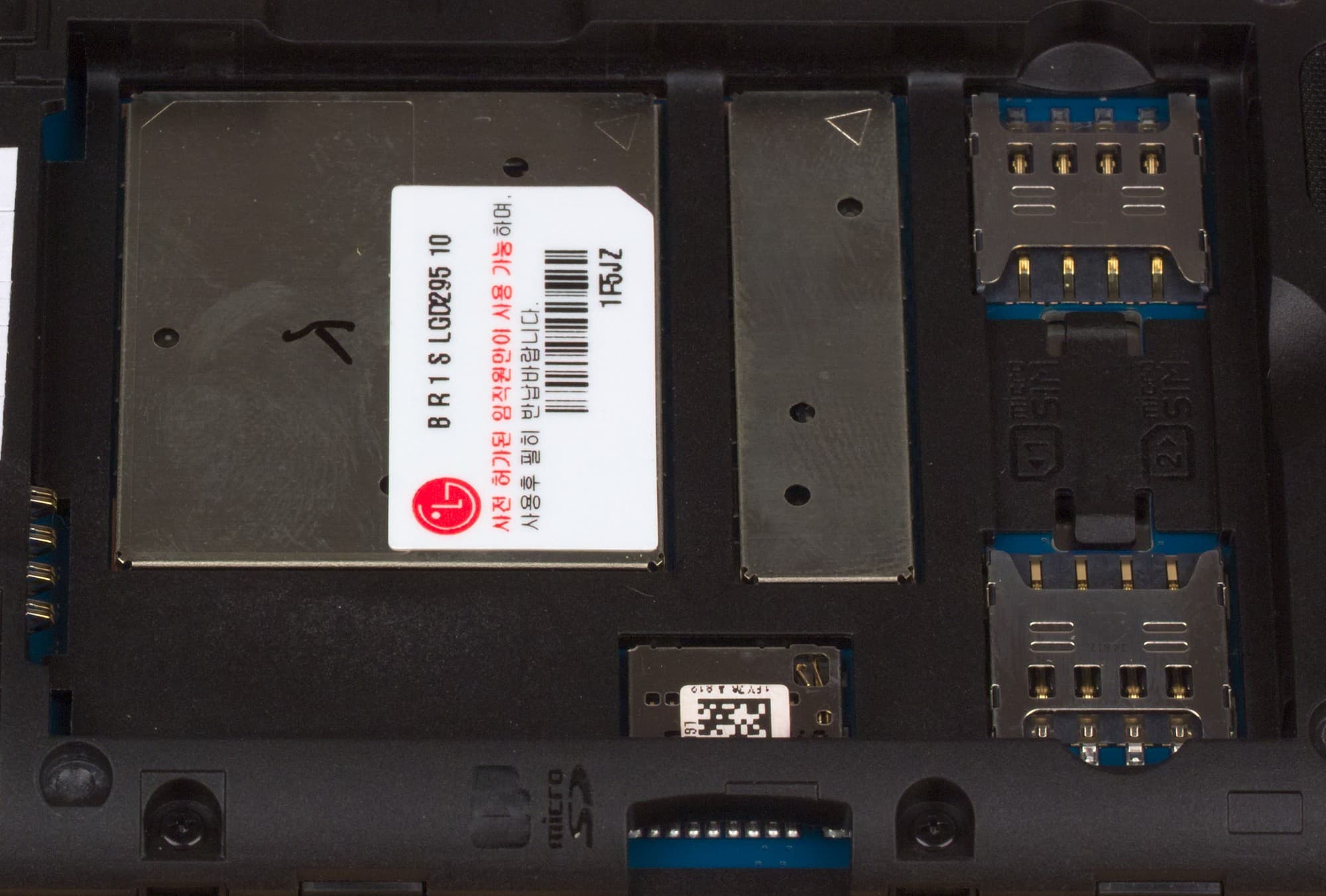 Под крышкой у LG L Fino скрываются слоты для двух карточек Micro-SIM и карты памяти, все это сверху прикрывается съемной аккумуляторной батареей, без изъятия которой заменить SIM-карты нельзя. В этом и во многом другом кроются существенные отличия внутренного строения корпусов LG L Fino и L Bello: у старшей модели ни один из слотов батареей не прикрыт, карточки доступны без необходимости снятия аккумулятора.