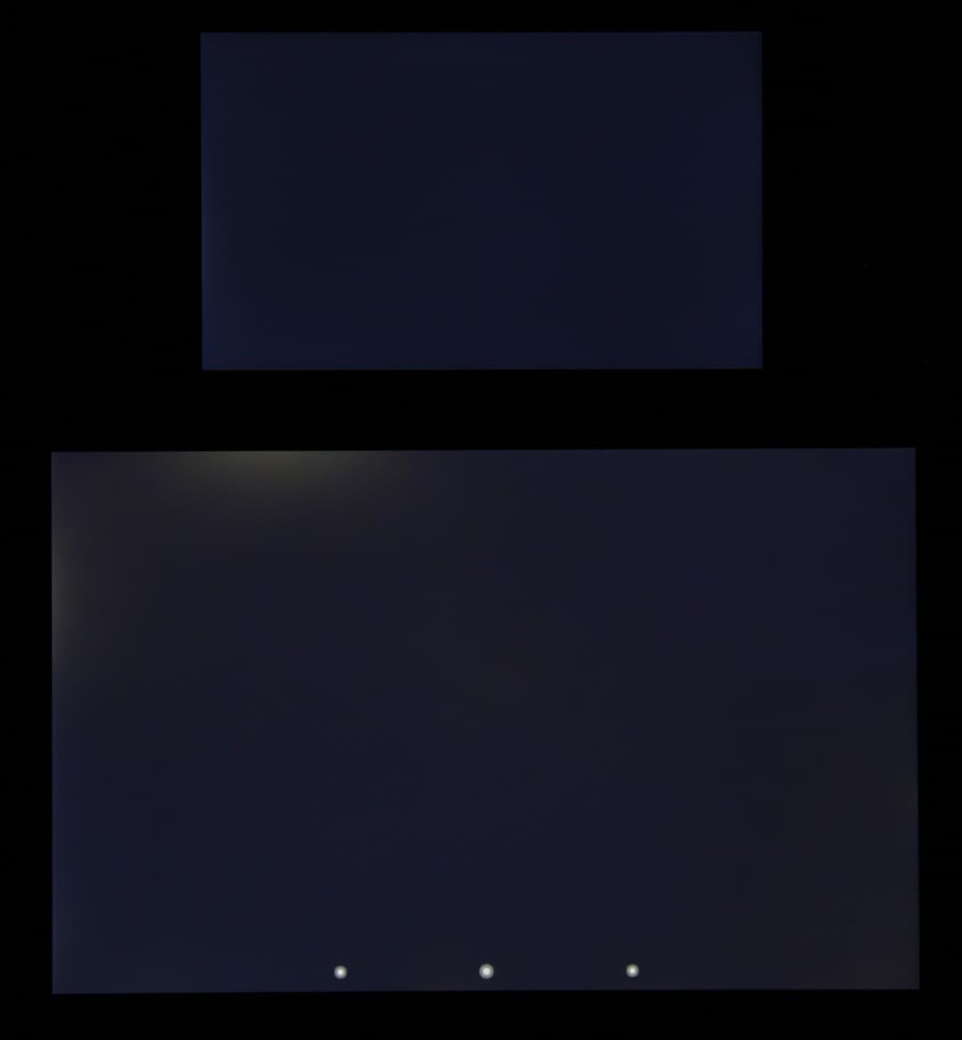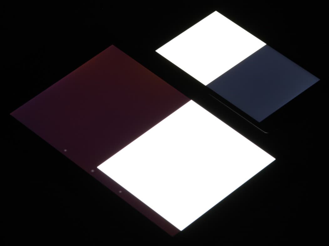 Яркость под углом у экранов уменьшилась (как минимум в 5 раз, исходя из разницы в выдержке), но в случае LG L Fino падение яркости больше. Черное поле при отклонении по диагонали высветляется сильно и приобретает фиолетовый оттенок или остается почти нейтрально-серым. Фотографии ниже это демонстрируют (яркость белых участков в перпендикулярном плоскости экранов направлении примерно одинаковая!):