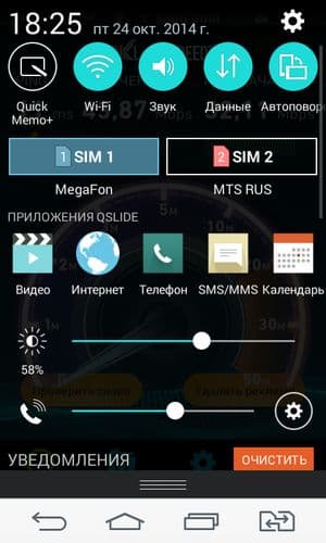 LG L Fino работает в данный момент на программной платформе Google Android версии 4.4.2. Поверх интерфейса ОС компания установила собственный пользовательский интерфейс LG Optimus UI, значительно видоизменяющий и дополняющий стандартный. Прорисовка элементов стала крупнее, на экран многое не влезает. Например, меню уведомлений с его массой разнообразных элементов даже не способно продемонстрировать на первом экране ни одного уведомления — все место занимают ряды иконок быстрого доступа, ползунки регулировки яркости и громкости, да ряды приложений QSlide. Для того чтобы увидеть собственно уведомления, приходится прокручивать меню, а это частенько приводит к его сворачиванию.