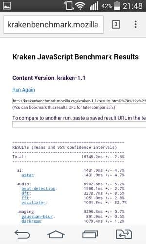 Что касается бенчмарков для оценки скорости движка javascript, то стоит всегда делать скидку на то, что в них результаты существенно зависят от браузера, в котором запускаются, так что сравнение может быть истинно корректным только на одинаковых ОС и браузерах, а такая возможность имеется при тестировании не всегда. В случае с ОС Android мы всегда стараемся использовать Google Chrome.