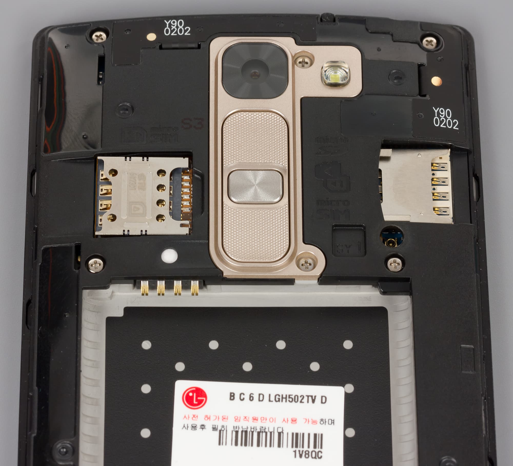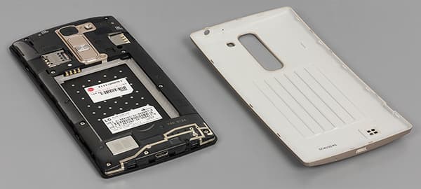При этом крышка достаточно легко снимается с корпуса — для этого сбоку имеется небольшой уступ под ноготь. Под крышкой можно обнаружить стандартный комплект слотов: два — для SIM-карт формата Micro-SIM, а третий — для карты памяти microSD. Батарея здесь съемная, она не подпирает собой карточки, но горячая их замена все равно невозможна, придется перезагружать смартфон.