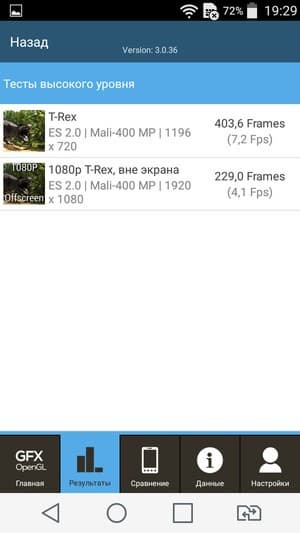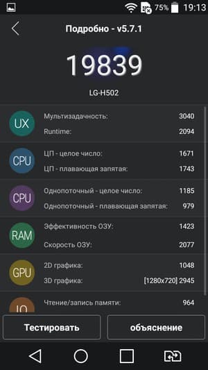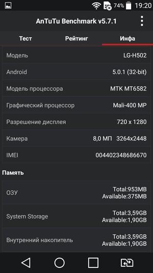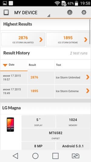 По результатам тестирования платформа показала результаты ожидаемо скромные, ниже среднего значения (менее 20К в AnTuTu), даже если сравнивать с другими современными платформами начального уровня. По уровню производительности SoC MT6582 оказывается примерно на одном уровне с одной из самых слабых современных платформ Qualcomm Snapdragon 410, а ее GPU даже уступает Adreno 306 в Qualcomm Snapdragon 410. В итоге по уровню производительности аппаратной платформы смартфон LG Magna к среднему уровню отнести сложно — это, скорее, уровень ближе к начальному, хотя возможностей аппарата хватит для выполнения основных задач и проигрывания видеороликов с разрешением вплоть до 1080р. Однако для современных требовательных игр возможностей устаревшего и откровенно слабого GPU Mali 400MP явно недостаточно.