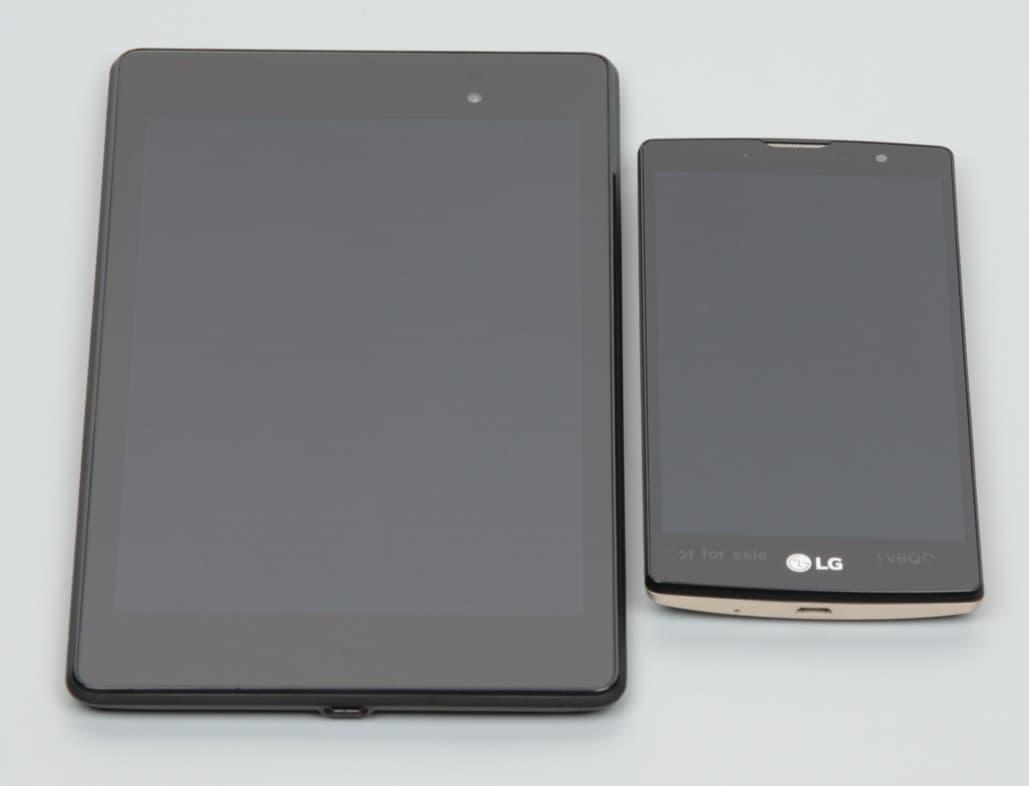 Лицевая поверхность экрана выполнена в виде стеклянной пластины с зеркально-гладкой поверхностью, устойчивой к появлению царапин. Судя по отражению объектов антибликовые свойства экрана не хуже, чем у экрана Google Nexus 7 (2013) (далее просто Nexus 7). Для наглядности приведем фотографию, на которой в выключенных экранах отражается белая поверхность (слева — Nexus 7, справа — LG Magna, далее их можно различать по размеру):