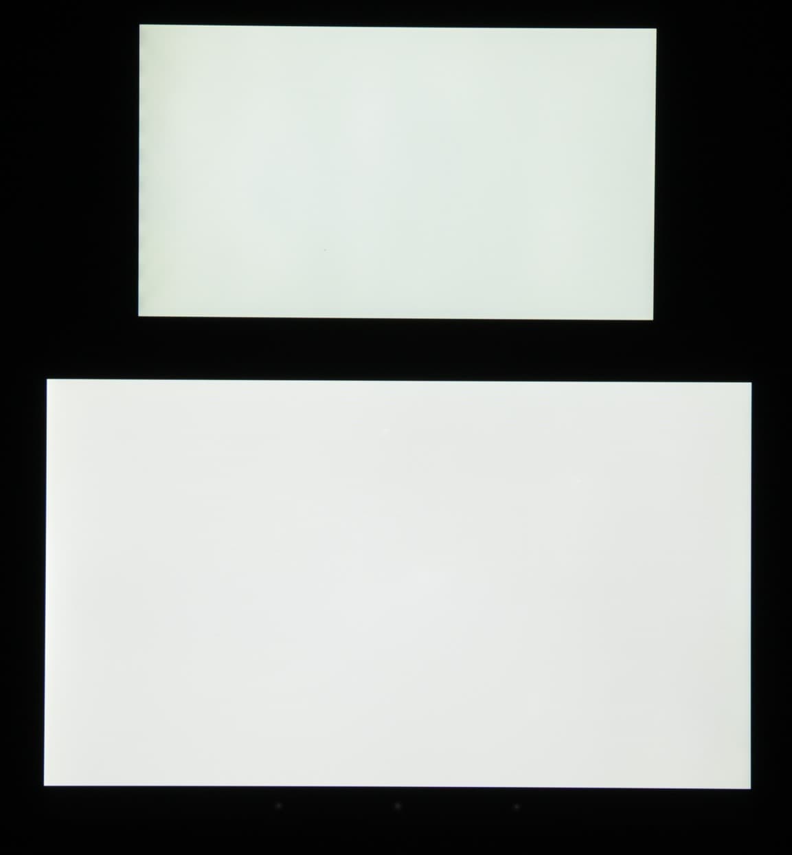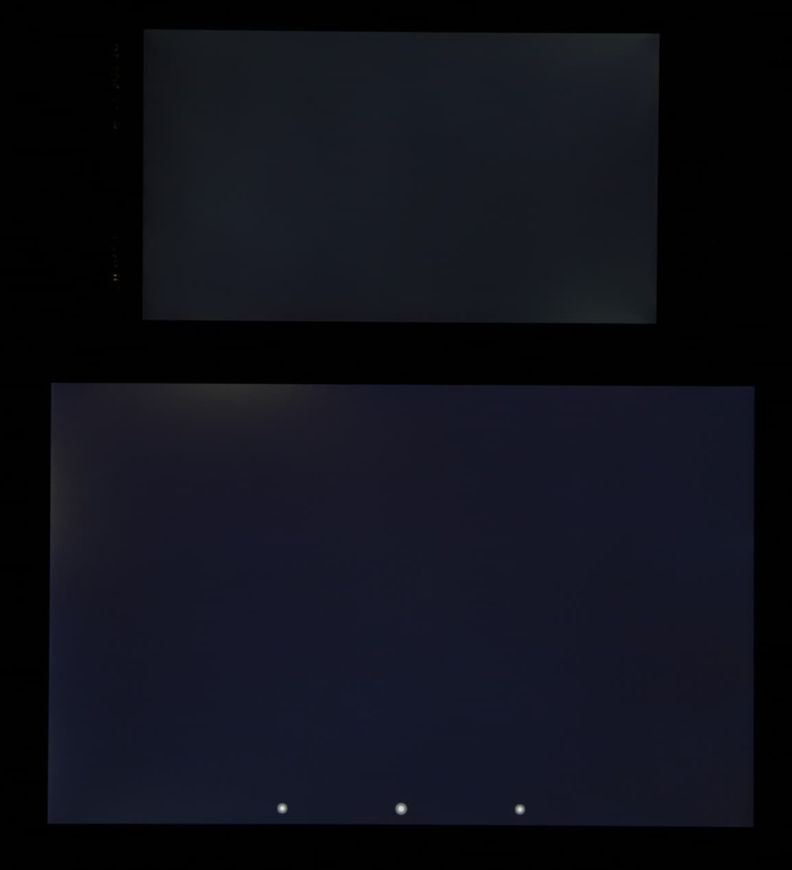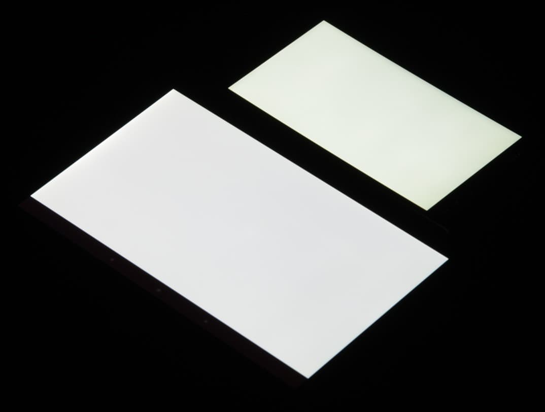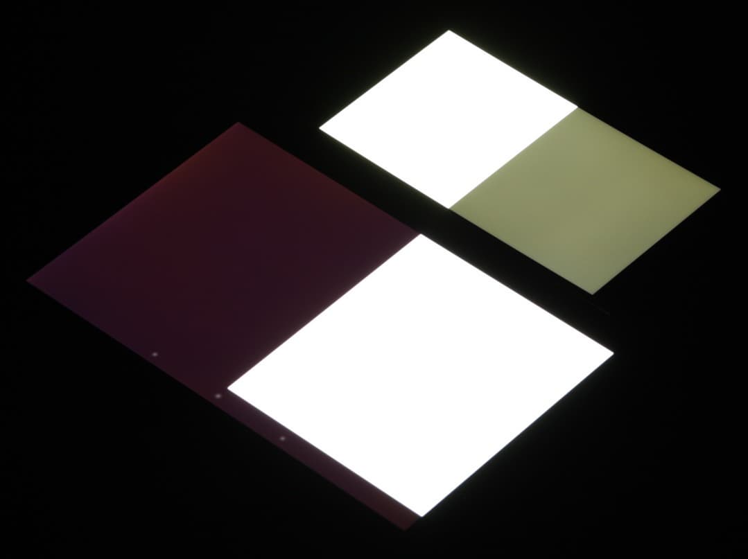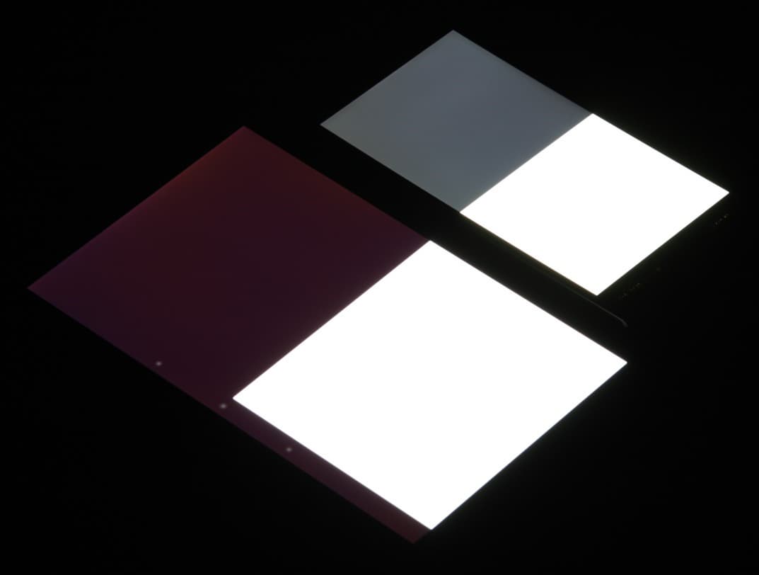 Яркость под углом у экранов уменьшилась (как минимум в пять раз, исходя из разницы в выдержке), однако в случае LG Magna яркость снизилась чуть меньше. Черное поле при отклонении по диагонали высветляется сильно, но остается условно нейтрально-серым по оттенку. Фотографии ниже это демонстрируют (яркость белых участков в перпендикулярном плоскости экранов направлении у экранов одинаковая!):