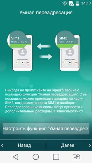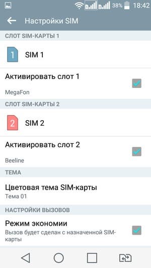Смартфон обеспечивает работу с двумя SIM-картами по стандарту Dual SIM Dual Standby. Не считая специальной кнопки для быстрой смены приоритетной SIM-карты, реализация работы с двумя SIM-картами в целом стандартна для данной платформы. Радиомодуль здесь один, поэтому активный разговор может быть только один. В настройках можно назначить для каждой из карт имя, цветовую тему и оформление значков. В момент набора номера выбора между двумя SIM-картами не предоставляется — для этого служит отдельная кнопка быстрого переключения приоритетной карты, расположенная в нижнем ряду иконок. С сетями 3G может работать SIM-карта в любом слоте, однако одновременно в этом режиме может работать лишь одна из карт (вторая будет работать только в 2G).