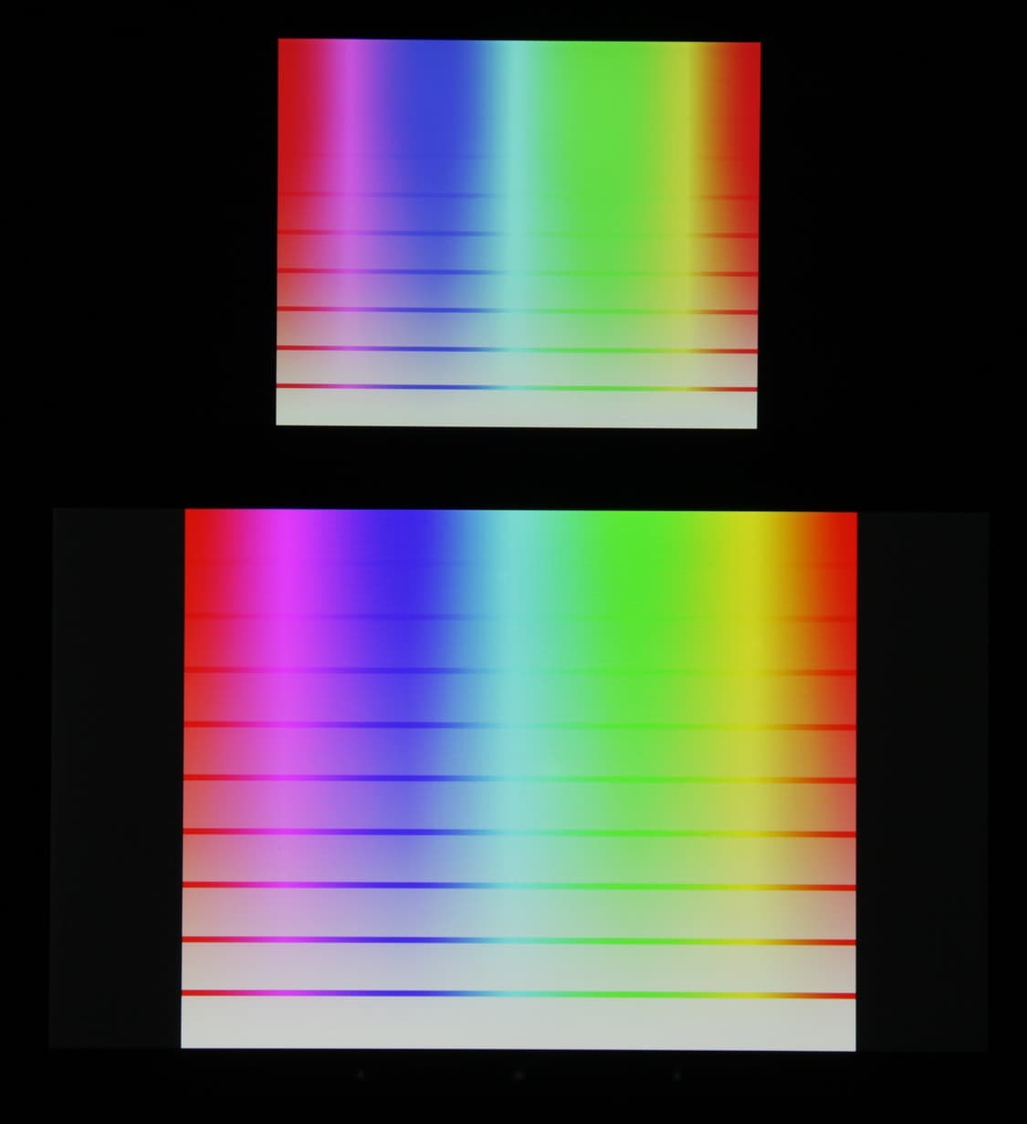 Видно, что по мере увеличения насыщенности (снизу вверх) на основном поле горизонтальные полоски с насыщенными оттенками в случае LG Magna быстро становятся неразличимыми, а границы между оттенками очень выражены. Теперь под углом примерно 45 градусов к плоскости и к стороне экрана: