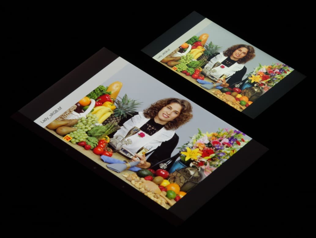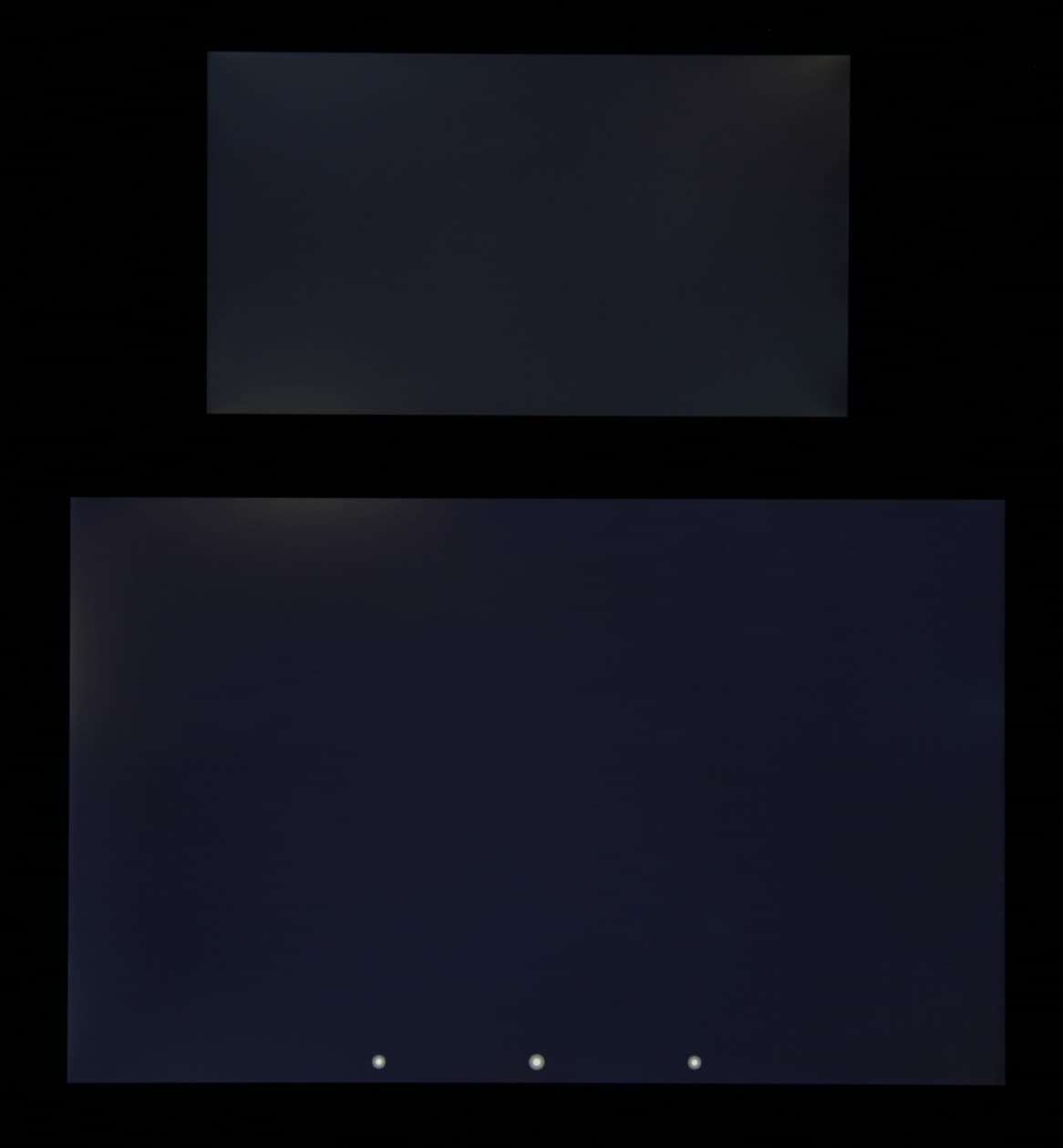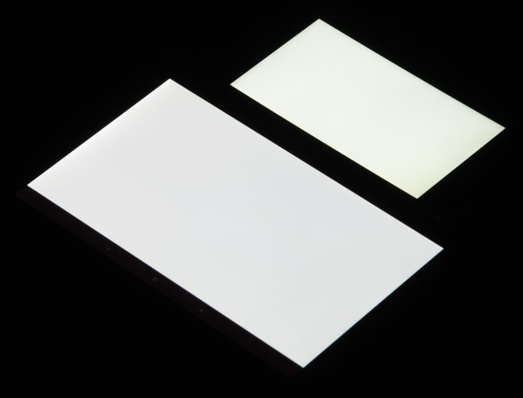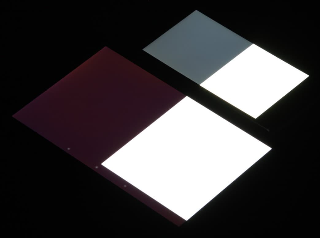 Яркость под углом у экранов уменьшилась (как минимум в пять раз, исходя из разницы в выдержке), однако в случае LG Spirit яркость снизилась чуть меньше. Черное поле при отклонении по диагонали высветляется сильно, но остается условно нейтрально-серым по оттенку. Фотографии ниже это демонстрируют (яркость белых участков в перпендикулярном плоскости экранов направлении у экранов одинаковая!):