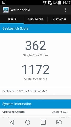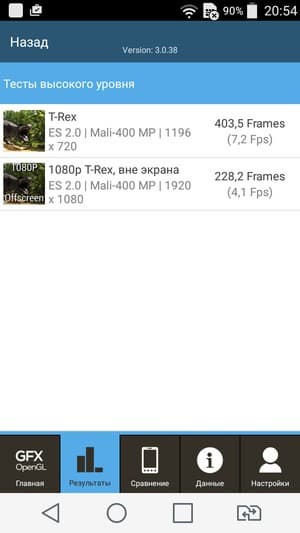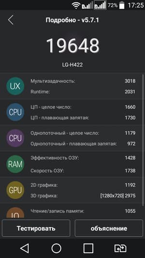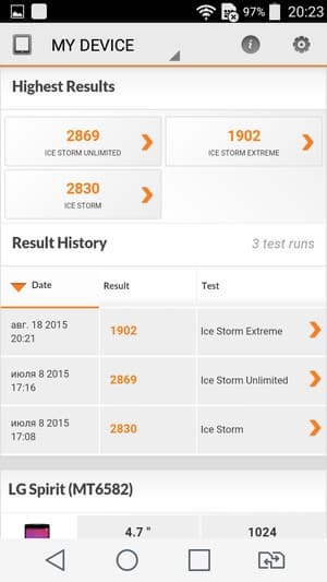 По результатам тестирования платформа показала результаты ожидаемо скромные, ниже среднего значения (в районе 20К в AnTuTu), даже если сравнивать с другими современными платформами начального уровня. По уровню производительности SoC MT6582 оказывается даже немного слабее популярной современной платформы начального уровня Qualcomm Snapdragon 410. В итоге по уровню производительности аппаратной платформы смартфон LG Spirit относится скорее к начальному уровню.