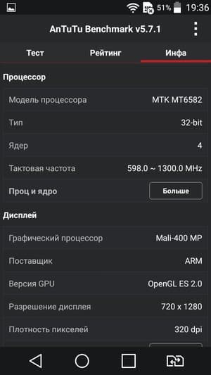 - SoC MediaTek MT6582, 1,3 ГГц, 4 ядра ARM Cortex-A7