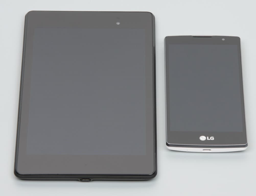 Лицевая поверхность экрана выполнена в виде стеклянной пластины с зеркально-гладкой поверхностью, устойчивой к появлению царапин. Судя по отражению объектов антибликовые свойства экрана чуть лучше, чем у экрана Google Nexus 7 (2013) (далее просто Nexus 7). Для наглядности приведем фотографию, на которой в выключенных экранах отражается белая поверхность (слева — Nexus 7, справа — LG Spirit, далее их можно различать по размеру):