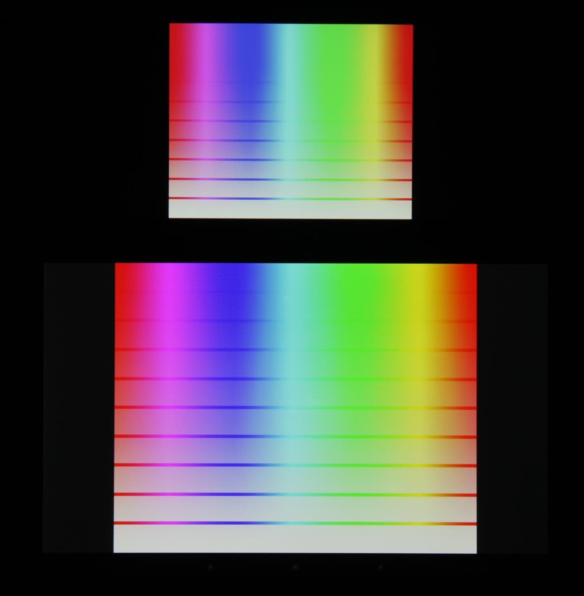 Видно, что по мере увеличения насыщенности (снизу вверх) на основном поле горизонтальные полоски с насыщенными оттенками в случае LG Spirit быстро становятся неразличимыми, а границы между оттенками очень выражены. Теперь под углом примерно 45 градусов к плоскости и к стороне экрана: