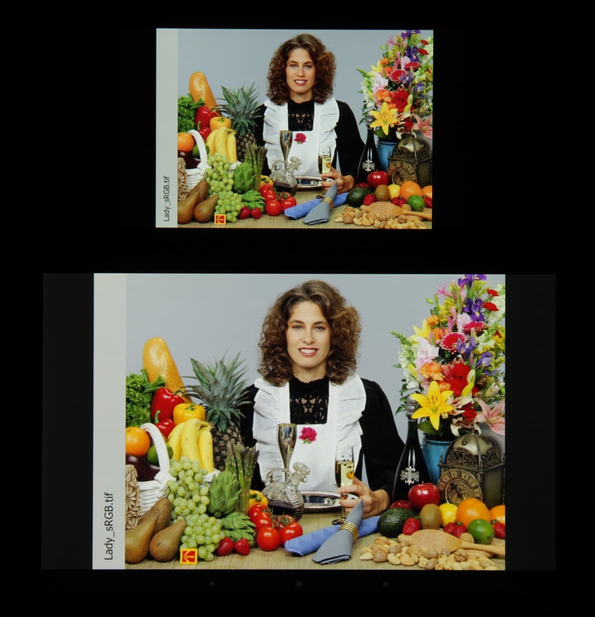 Производитель компенсирует уменьшенный охват за счет повышения цветового контраста, но бесследно это не проходит, так как различимость градаций в области насыщенных цветов уменьшается. Баланс оттенков на шкале серого средний, так как цветовая температура выше 6500 К, а отклонение от спектра абсолютно черного тела (ΔE) больше 10, что даже для потребительского устройства считается плохим показателем. Баланс искажен, разумеется, за счет избытка синей и зеленой компоненты, что при прочих равных условиях приводит к некоторому повышению яркости. Хорошо хоть, что при этом цветовая температура и ΔE мало изменяются от оттенка к оттенку — это положительно сказывается на визуальной оценке цветового баланса. (Самые темные области шкалы серого можно не учитывать, так как там баланс цветов не имеет большого значения, да и погрешность измерений цветовых характеристик на низкой яркости большая.)