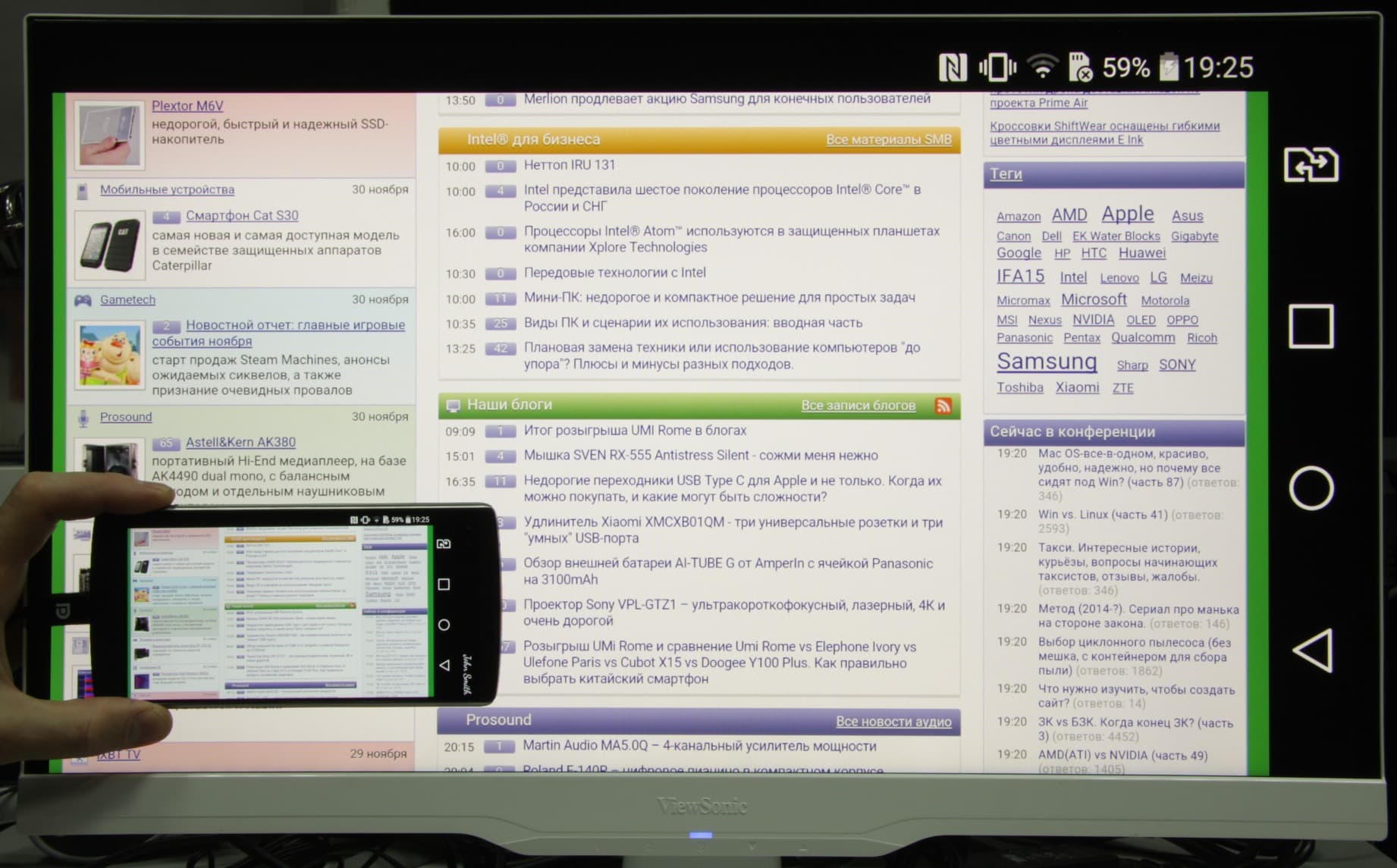В этом смартфоне есть поддержка адаптеров SlimPort (или Mobility DisplayPort), подключаемых к разъему micro-USB и обеспечивающих передачу видеосигнала (и звука) на внешние устройства отображения. Для его тестирования мы использовали монитор ViewSonic VX2363Smhl. При использовании этого монитора и имевшегося у нас адаптера SlimPort вывод осуществлялся в разрешении 1920 на 1080 пикселей с частотой 60 кадр/с. При ландшафтной ориентации смартфона вывод изображения на экраны смартфона и монитора осуществляется по возможности в ландшафтной ориентации, при этом изображение на мониторе вписано в границы экрана и представляет собой интерполированную копию экрана смартфона.