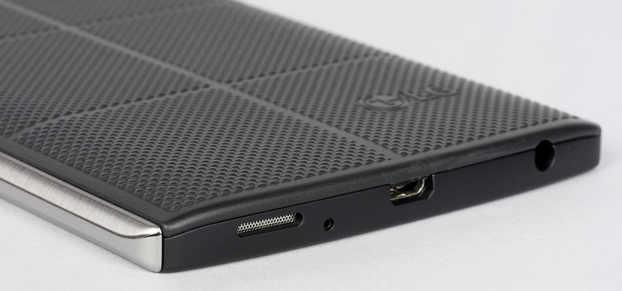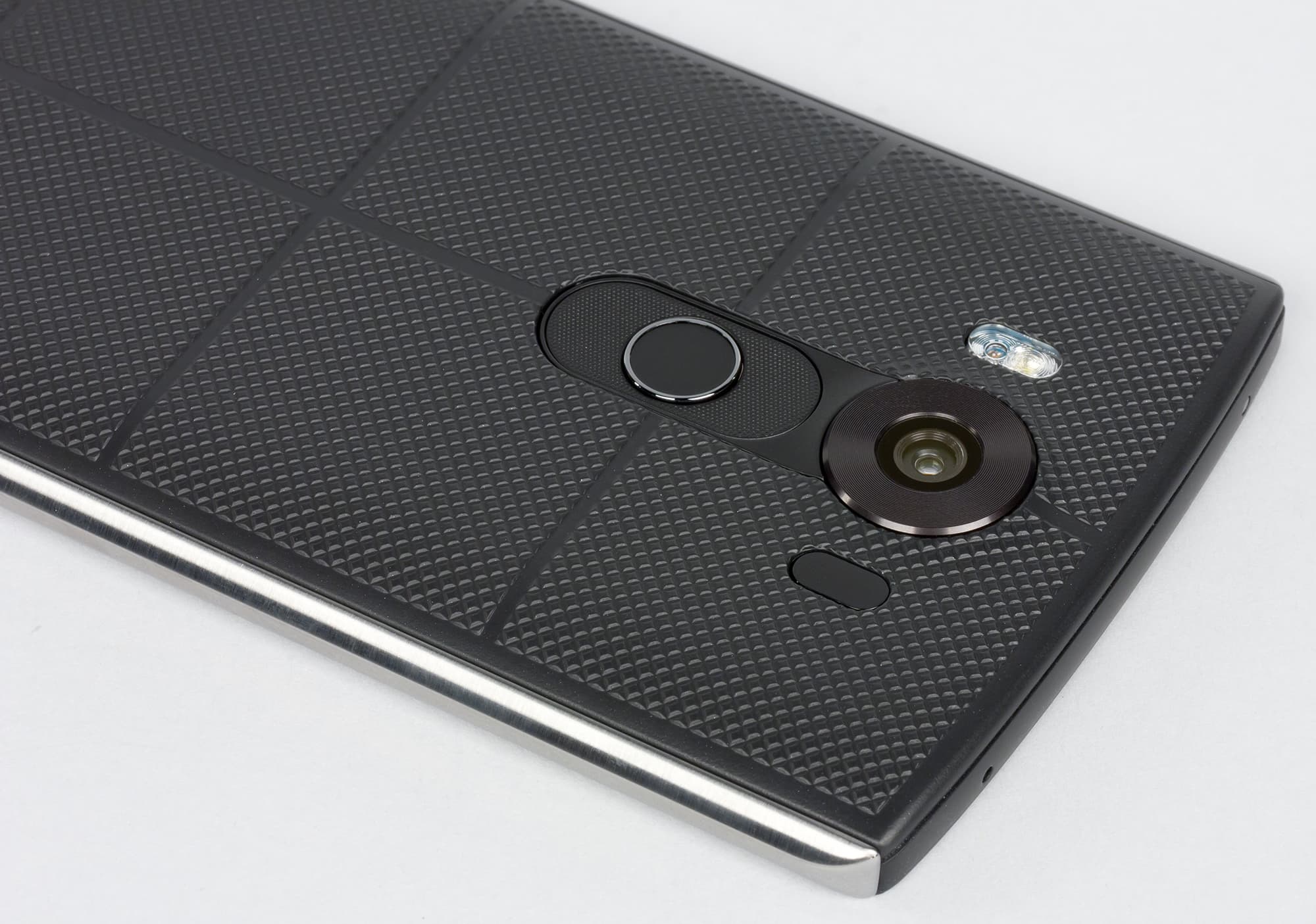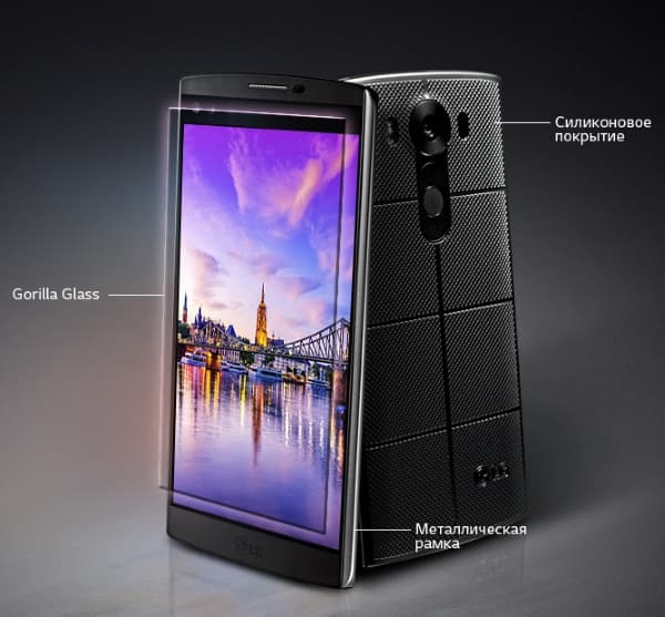 Что касается материалов изготовления, то они тоже далеко не просты. Во-первых, наибольшую площадь при соприкосновении с ладонью здесь составляет весьма приятная на ощупь крышка с прорезиненным эффектом. Рисунок текстур на задней панели разработан специально для того, чтобы смартфон не выскальзывал из рук. Это прочное силиконовое покрытие создает действительно необычный облик и при этом еще и обеспечивает максимальную защиту от повреждений. На нем не остается царапин, ему не страшны, по всей видимости, даже несильные удары, поскольку на этой резине не остается вмятин. В общем, судя по всему, LG V10 получил износостойкое и долговечное покрытие, но только время покажет, так ли это на самом деле.