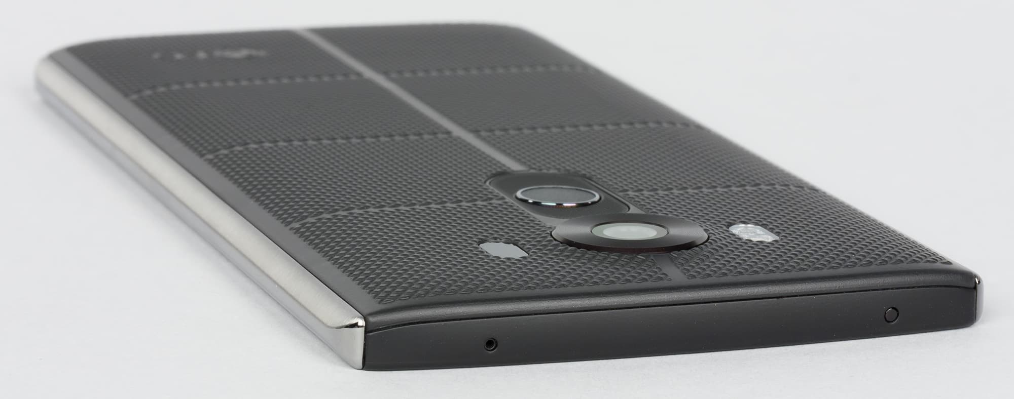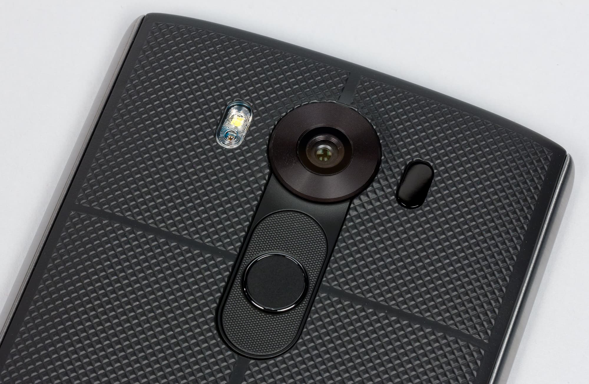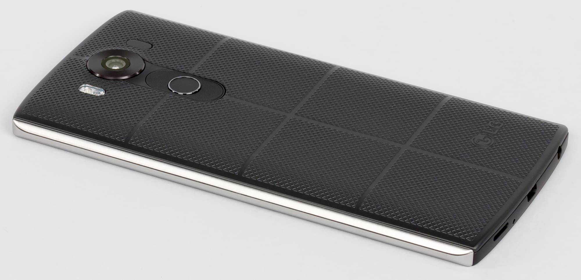 Что касается материалов изготовления, то они тоже далеко не просты. Во-первых, наибольшую площадь при соприкосновении с ладонью здесь составляет весьма приятная на ощупь крышка с прорезиненным эффектом. Рисунок текстур на задней панели разработан специально для того, чтобы смартфон не выскальзывал из рук. Это прочное силиконовое покрытие создает действительно необычный облик и при этом еще и обеспечивает максимальную защиту от повреждений. На нем не остается царапин, ему не страшны, по всей видимости, даже несильные удары, поскольку на этой резине не остается вмятин. В общем, судя по всему, LG V10 получил износостойкое и долговечное покрытие, но только время покажет, так ли это на самом деле.