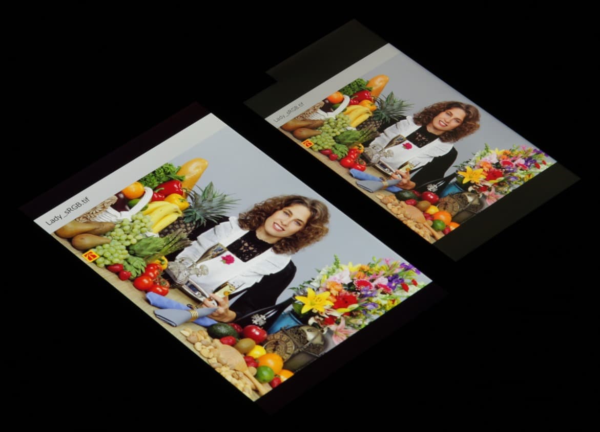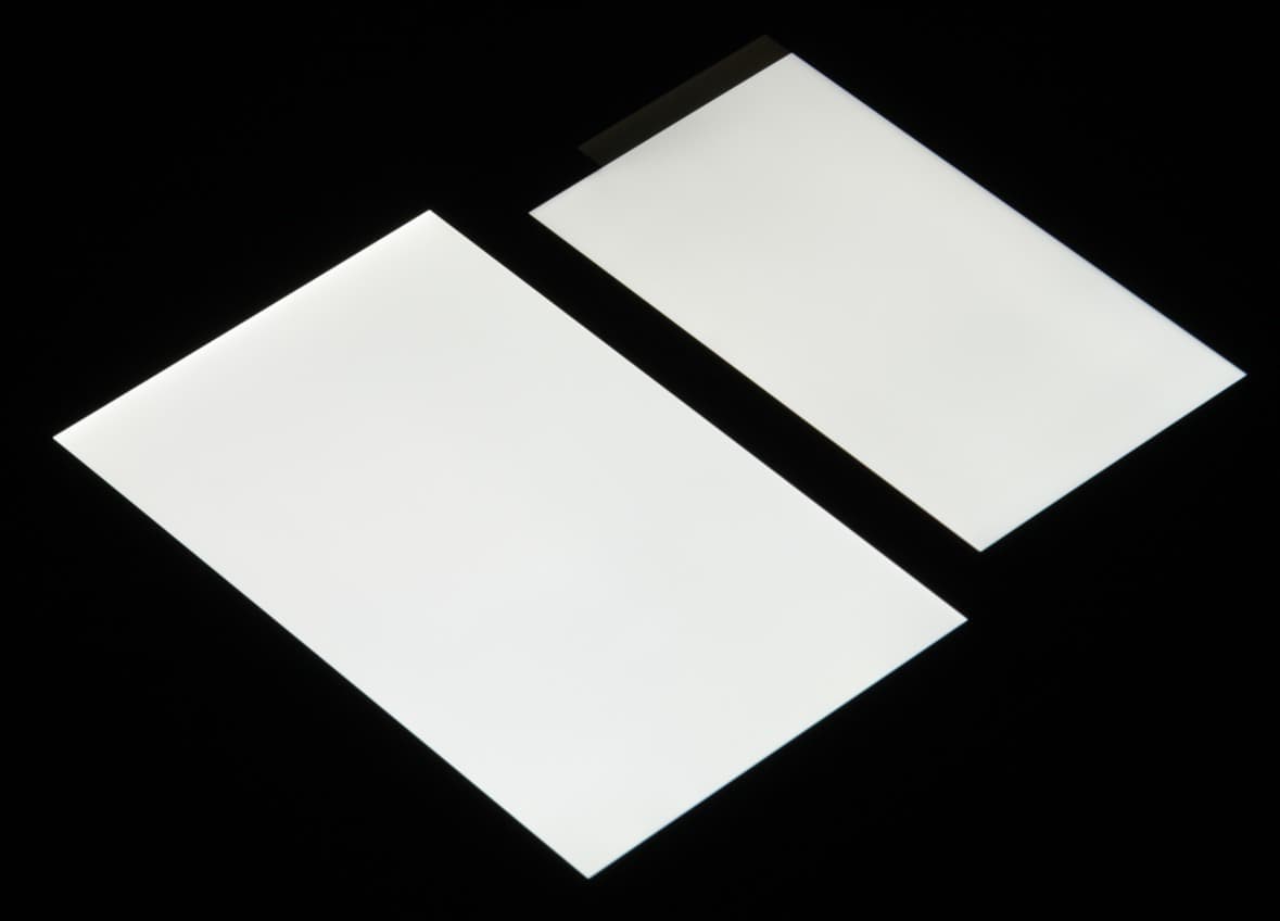 Отметим, что конструктивно основной и дополнительный экраны представляют собой единую ЖК-матрицу, у которой вырезан кусочек в углу, и в этом углу с краю установлен независимо управляемый светодиод, подсвечивающий верхнюю часть экрана. Тем самым при выводе информации только на дополнительный экран основная подсветка не включается, что существенно экономит энергию. Далее в описании оба экрана никак не разделяются. Экран имеет хорошие углы обзора без значительного сдвига цветов даже при больших отклонениях взгляда от перпендикуляра к экрану и без инвертирования оттенков. Для сравнения приведем фотографии, на которых на экраны LG V10 и Nexus 7 выведены одинаковые изображения, при этом яркость экранов изначально установлена примерно на 200 кд/м², а цветовой баланс на фотоаппарате принудительно переключен на 6500 К. Перпендикулярно к экранам белое поле: