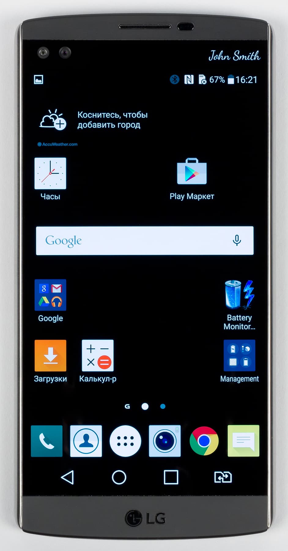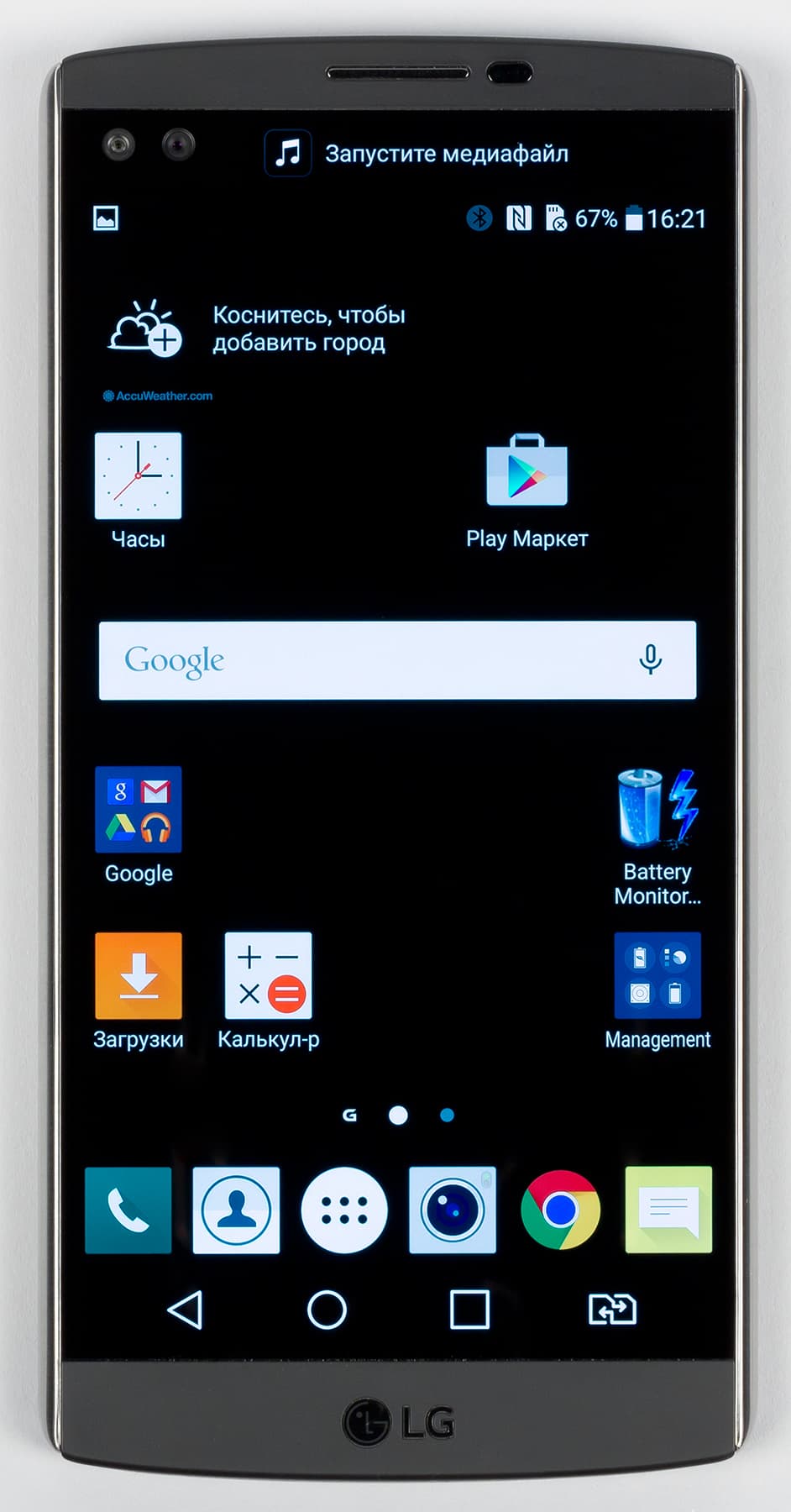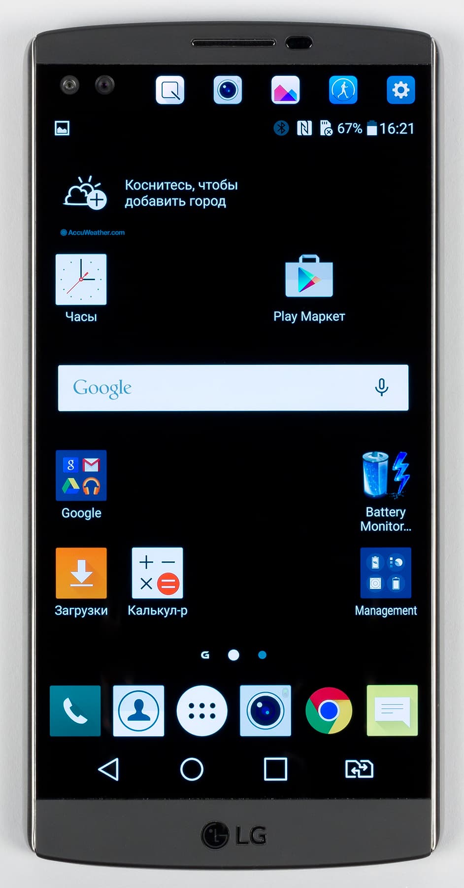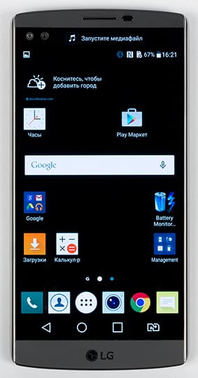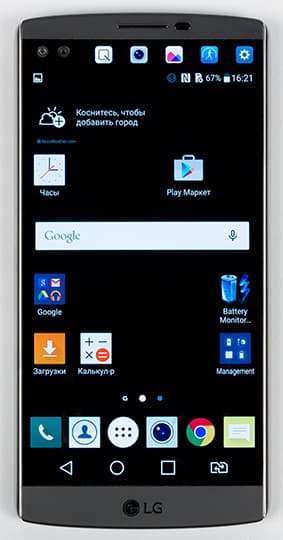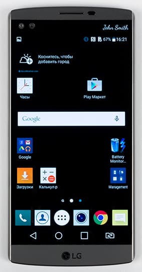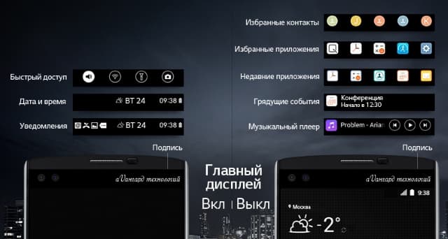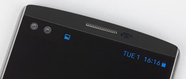 О втором экране можно сказать следующее: он имеет физические размеры 52×8 мм, хотя границы его разглядеть вообще-то весьма сложно. Диагональ его, согласно описанию, составляет 2,09 дюйма, а разрешение — 160×1040 точек с плотностью 513 ppi (той же, что у основного экрана). Этот второй, всегда активный дисплей расположен над основным и работает независимо от него. Он повышает функциональность LG V10 и при этом не расходует значительно заряд аккумулятора. Если основной дисплей включен, на второй можно выводить настраиваемый список приложений или, например, уведомления о входящих звонках и сообщениях, не отвлекая пользователя от просмотра фильма или игры. Если основной дисплей выключен, то второй может отображать информацию о погоде, времени, дате и заряде аккумулятора.